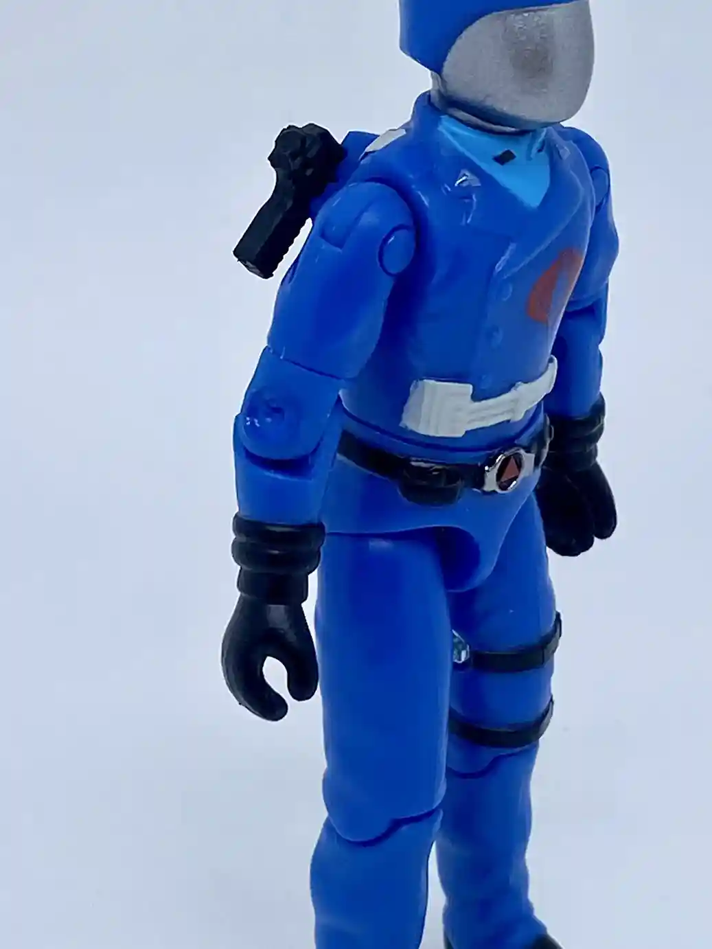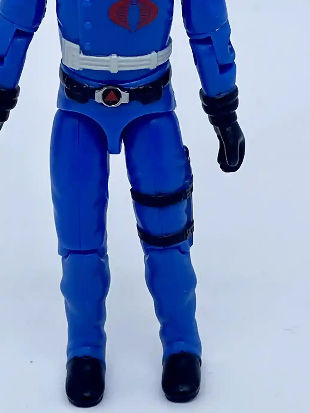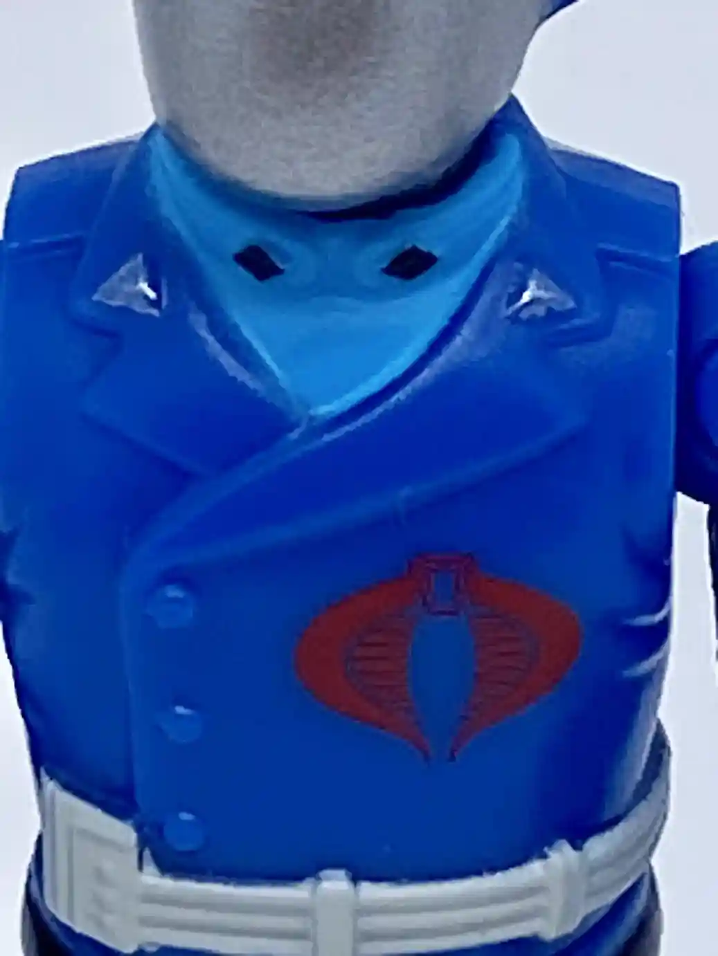 His chest design is also inspired by the vintage figure. Although his outfit colors are inspired by the Sunbow cartoon. He is wearing a light blue shirt underneath and he has accents on both his shirt lapels and his jacket lapels. The jacket lapels have silver accents, while the shirt lapels have black accents. He has a bright red Cobra insignia tampo’d on his chest and he is wearing a white belt strap around his waist as he does in G.I Joe the movie.