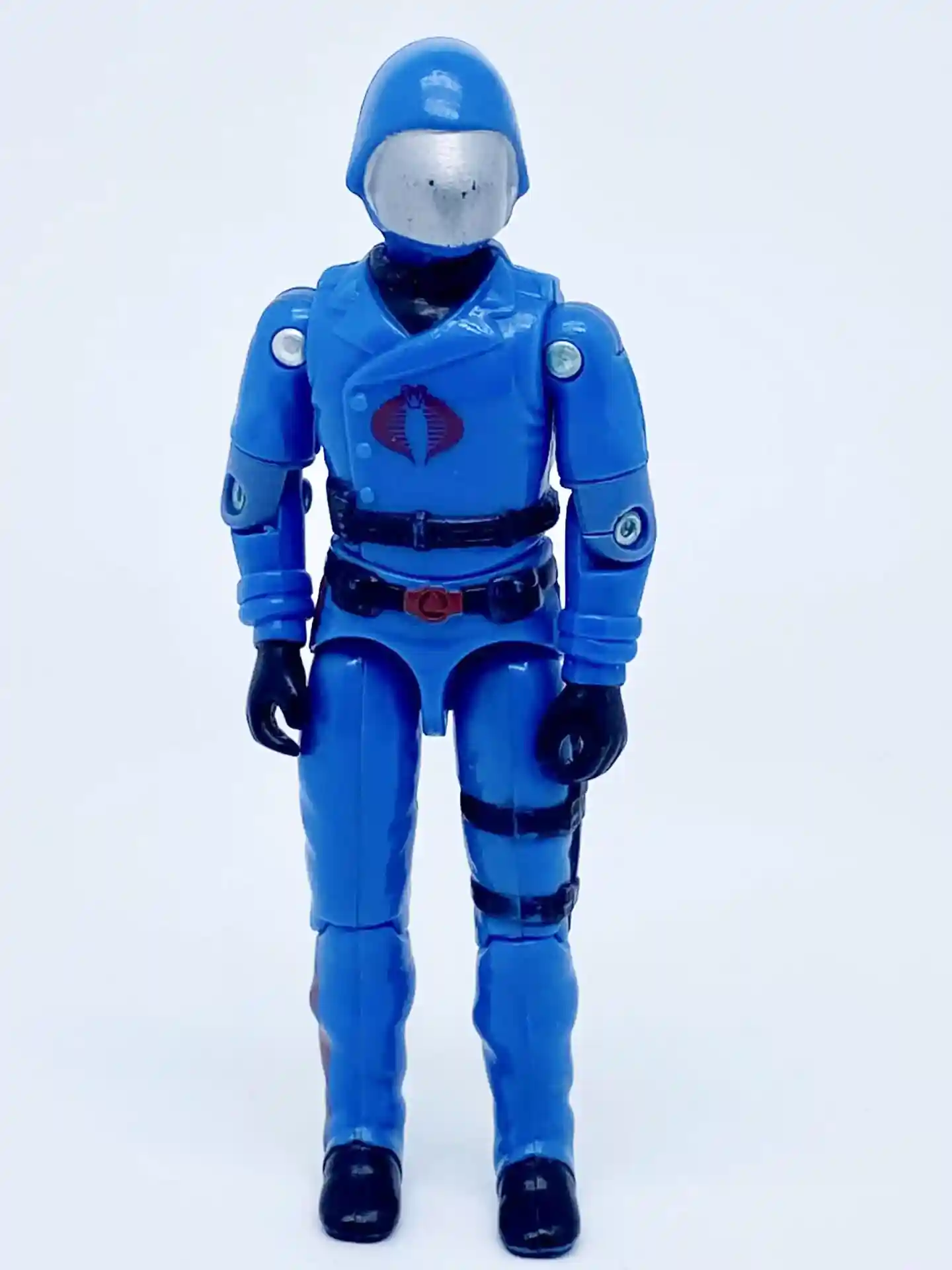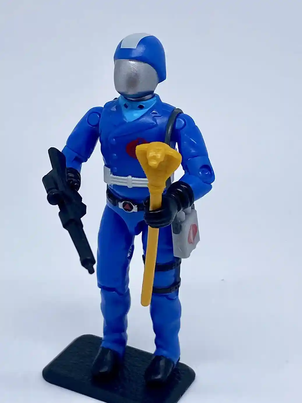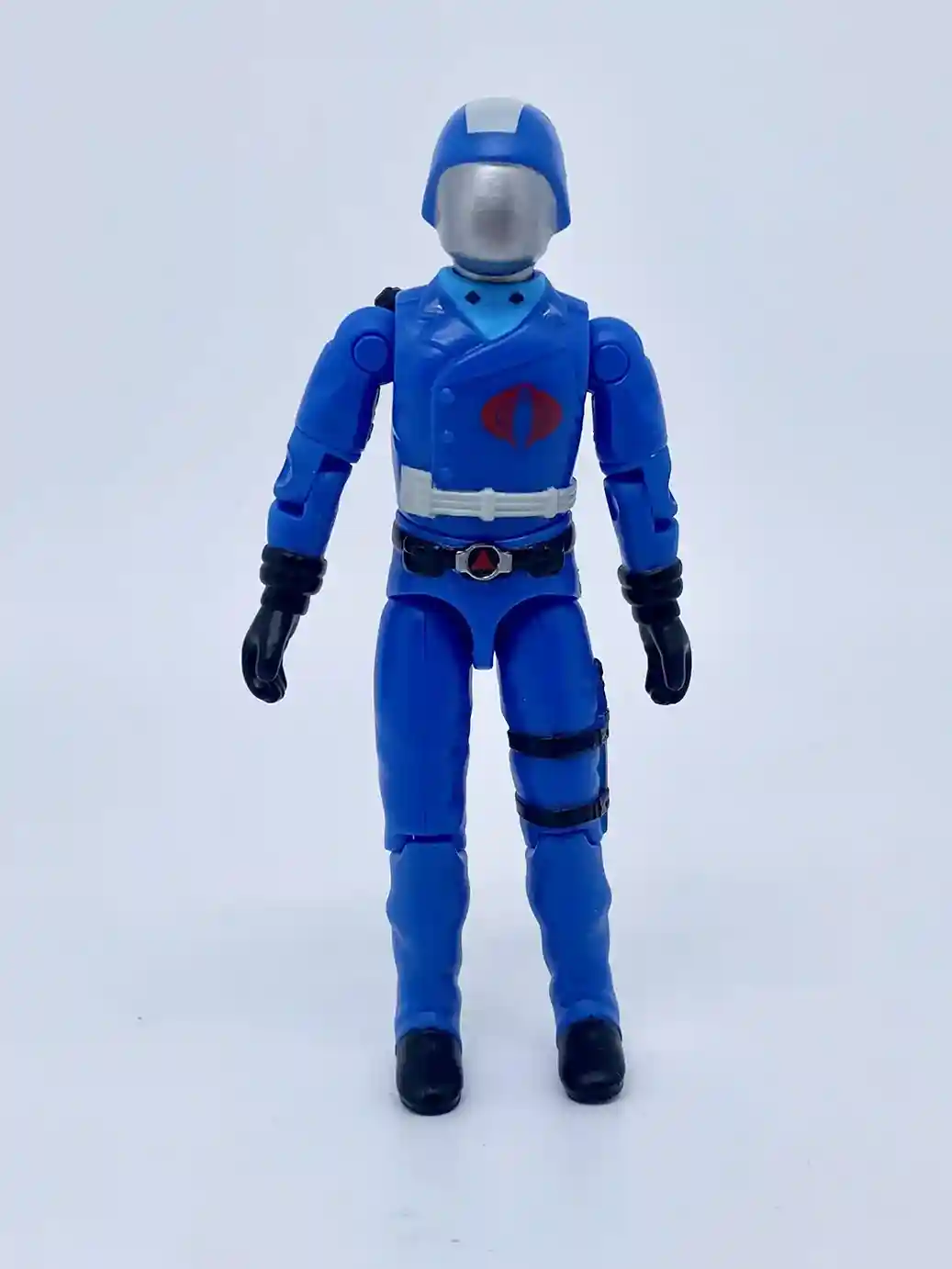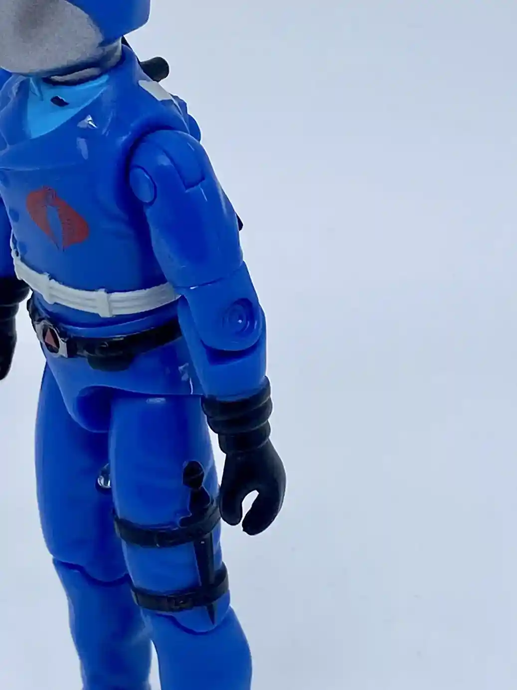 His chest design is also inspired by the vintage figure. Although his outfit colors are inspired by the Sunbow cartoon. He is wearing a light blue shirt underneath and he has accents on both his shirt lapels and his jacket lapels. The jacket lapels have silver accents, while the shirt lapels have black accents. He has a bright red Cobra insignia tampo’d on his chest and he is wearing a white belt strap around his waist as he does in G.I Joe the movie.
