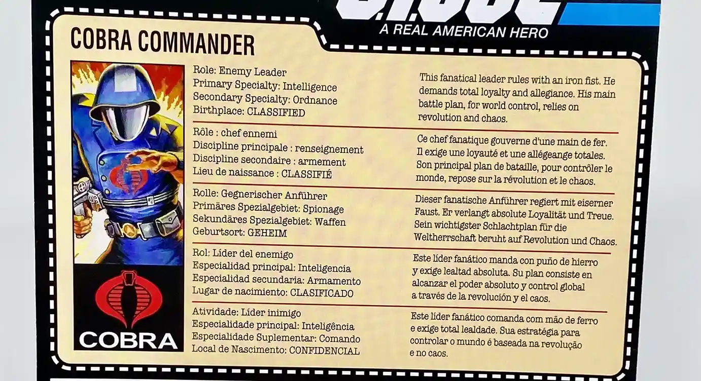 Cobra Commander’s file card gives us a glimpse into the Supreme leader’s past. Featuring his role as Enemy Leader, the brief file card description says his primary specialty is an Specialty Intelligence. His secondary specialty is Ordinance, and his real name is CLASSIFIED! Cobra Commander is a fanatical leader who rules with an iron fist! He demands absolute loyalty and his main objective is world domination based on revolution and chaos! This retro file card only gives us a brief look at what makes Coco tick. but the vintage file card gives us much more information and back story. First the date points are the same except on the vintage file card we get to see that Cobra Commander’s Secondary Specialty also includes experimental weaponry, which is why he is always making Destro cook up all those cockomammy weapons of mass destruction! It also goes on to mention that he has led uprising in the Middle East, Southeast Asia other other trouble spots around the world. He has kidnapped top leaders and scientist with the goal of making them reveal their most trusted secrets!