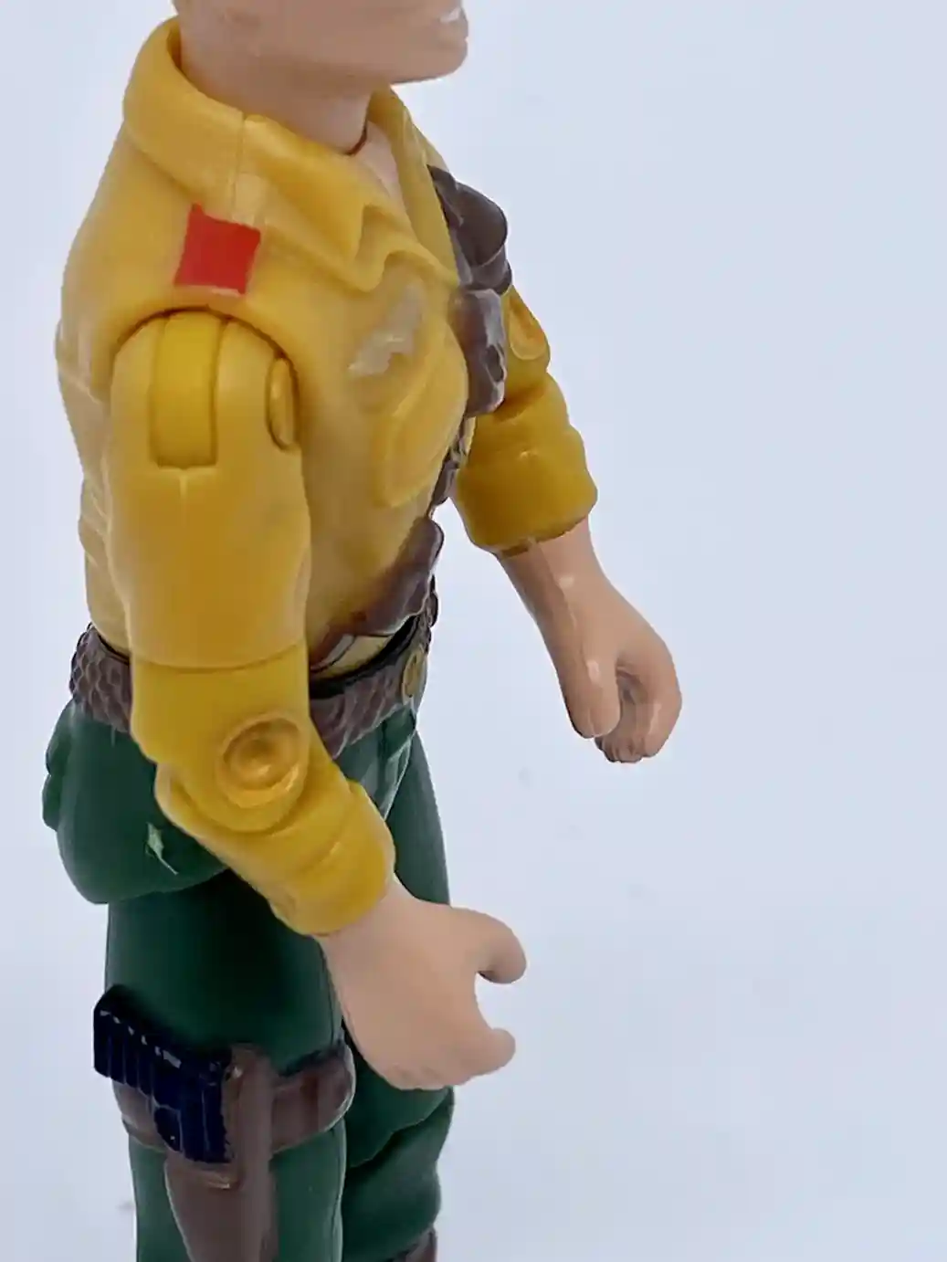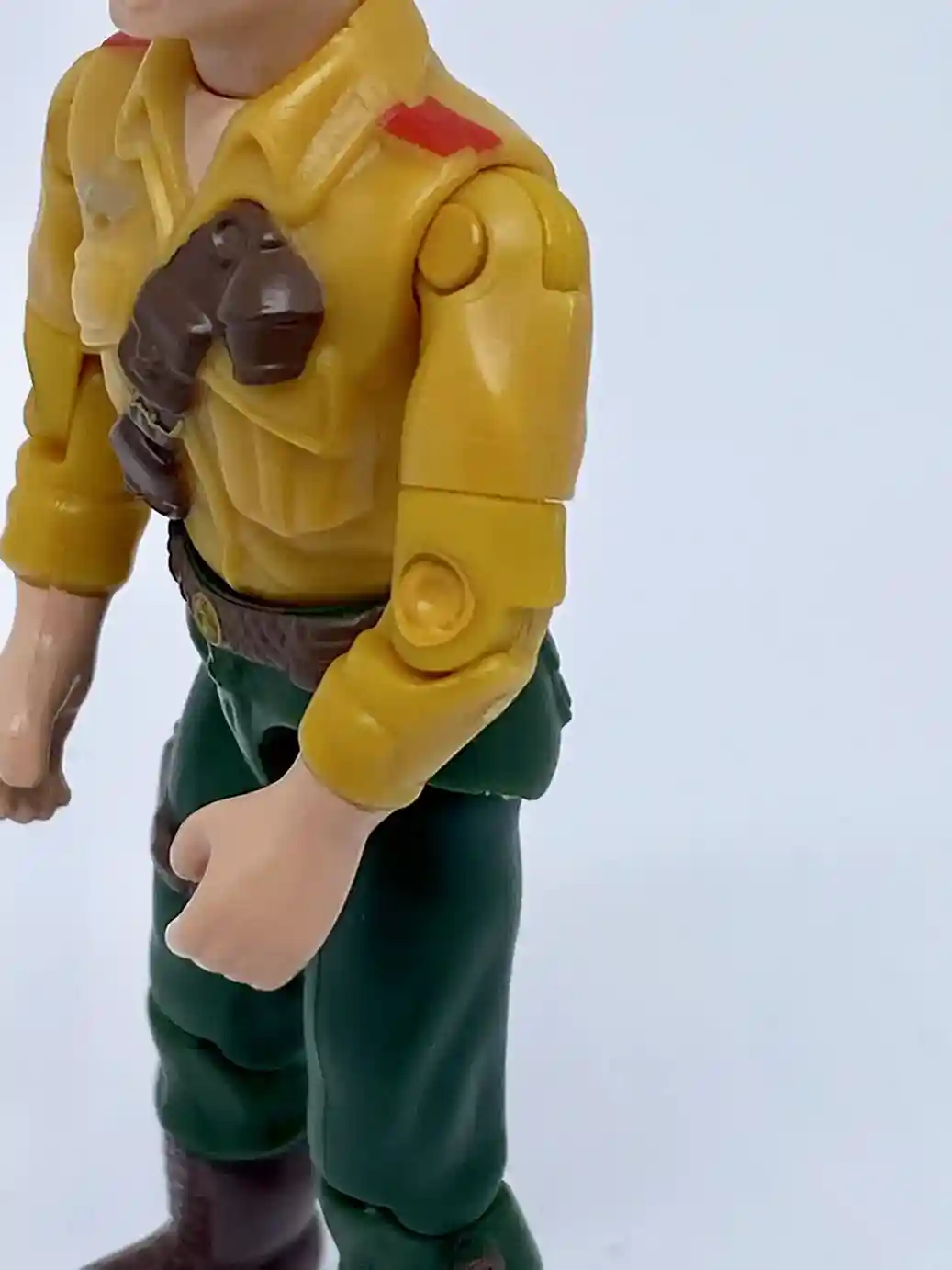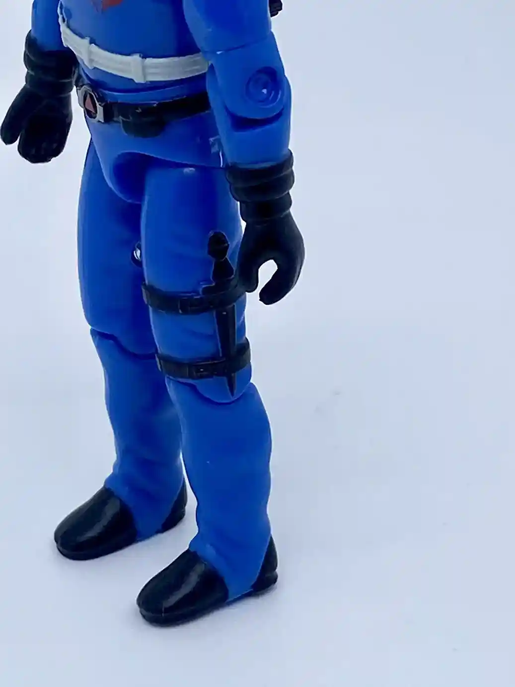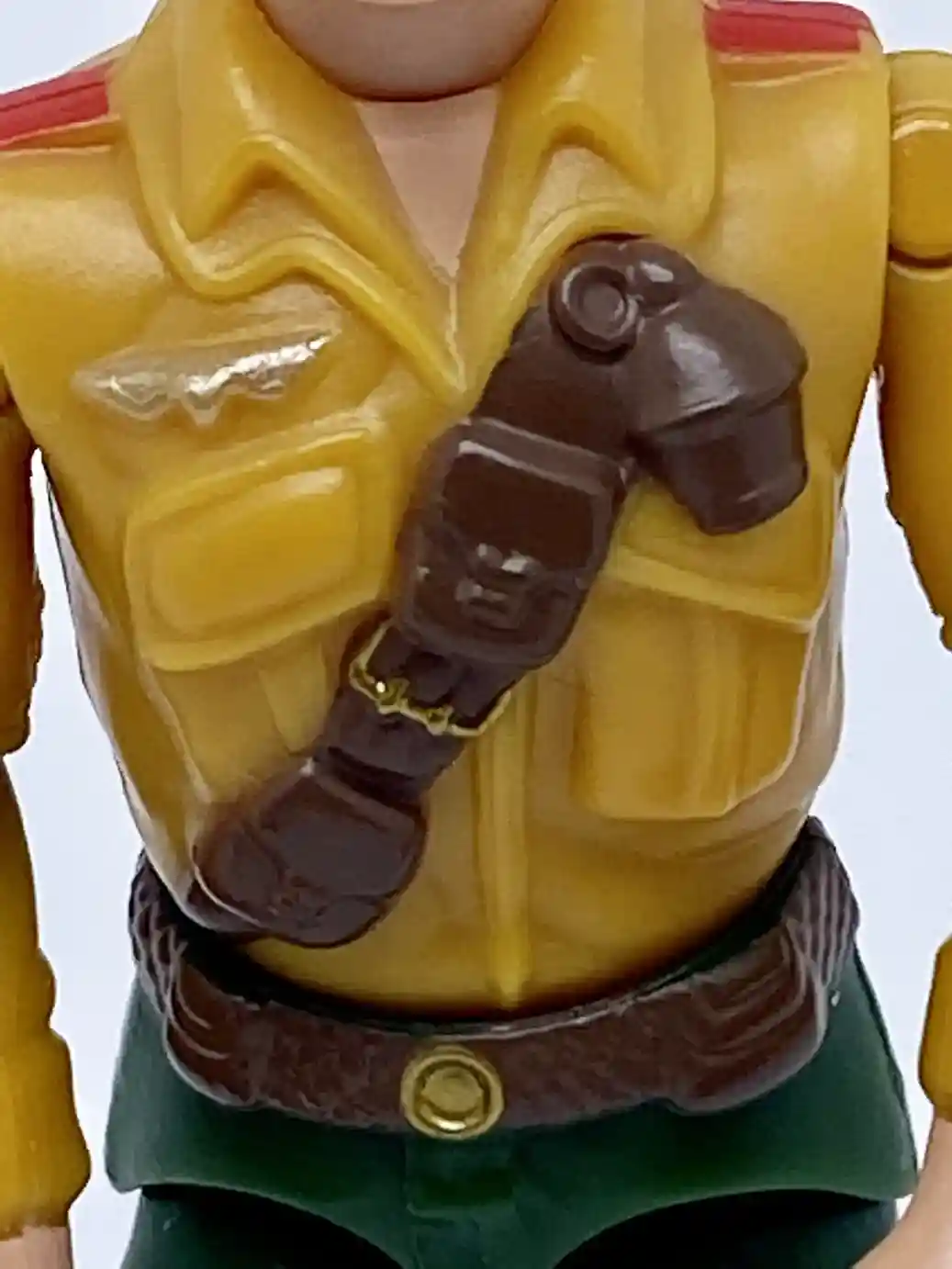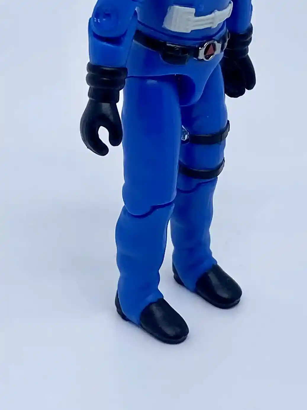 Besides the white belt strap on his upper waist, he is wearing a black belt with a silver belt buckle and red accent. The belt has a couple pockets molded on to it as well, same as the vintage figure, except slightly different paint apps.