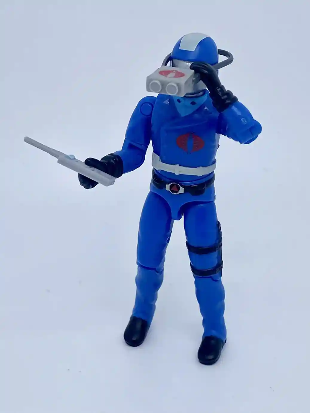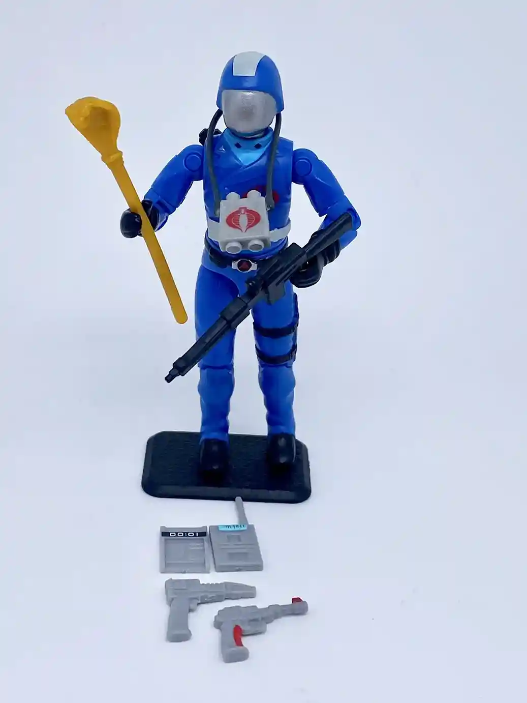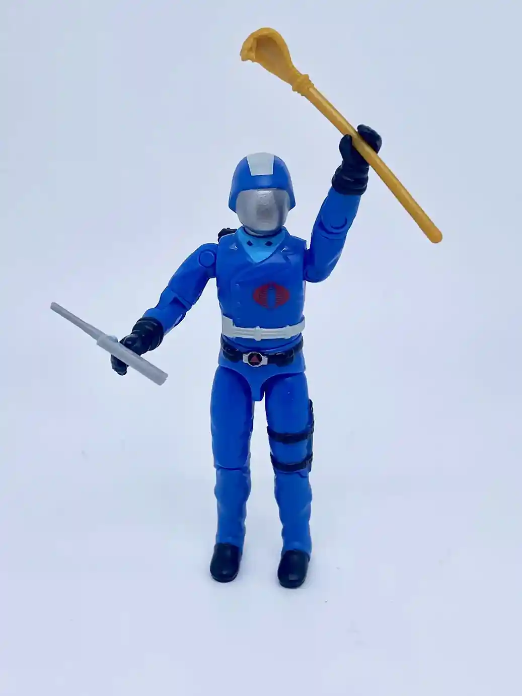 Cobra Commander comes dressed in his G.I Joe the Movie Sunbow bright blues with additional new paint apps that just make this new action figure pop! He has the cartoon looking head that includes the white stripe on his helmet. His bright blue outfit is accented by the light blue shirt and various accented paint applications on his lapels and belts. He is now outfitted with complete black gloves rather than just black hands like the vintage figure came with. And he includes a ton of fun accessories to pose Coco in all sorts of fun ways! I just love the newly included yellow snake staff and Cobra branded binocs!