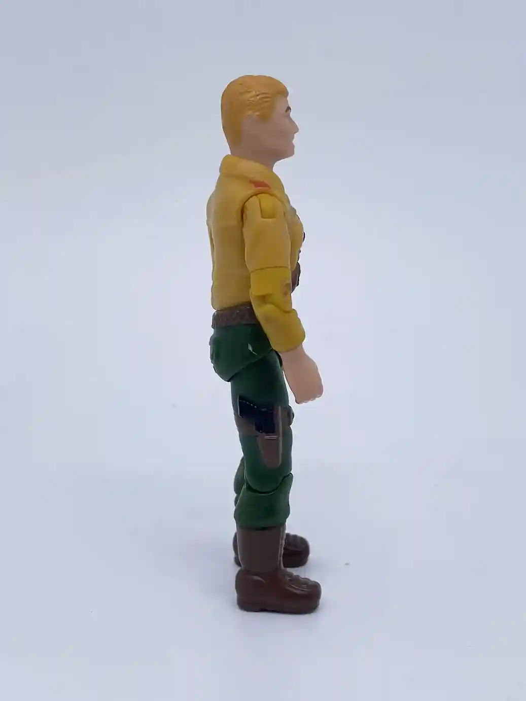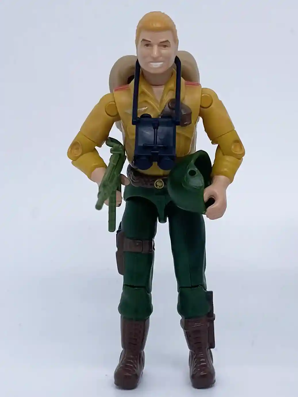 This new version of Duke has a vintage sculpt with a Sunbow color scheme. This new color scheme is a vast improvement to the vintage figure’s rather light and drab colors in my opinion. Don’t get me wrong, there will always be a special place in my heart for the vintage Duke action figure, but he never looked like he did on the cartoon series we all grew up with. The new Retro Duke looks like he stepped off the TV screen and into our collector’s cases! He has a brighter skin tone, blonder hair and much brighter yellow and green pants. The vintage figure features a tan shirt with green under shirt green grenades and drab green pants with no additional paint apps and brown boots. The new retro Duke also includes additional paint application accents on his shirt, belt and gun holster as well. They even changed Duke’s hair do a little, as the vintage had a part on his left side and the retro version has his hair combed back. The only issue on the retro Duke as we mentioned above was the wonky right eye. It’s nice to finally get an O-Ring Duke that looks like his cartoon counterpart!
