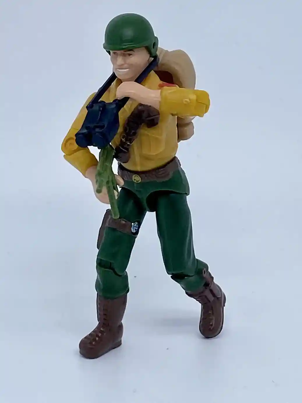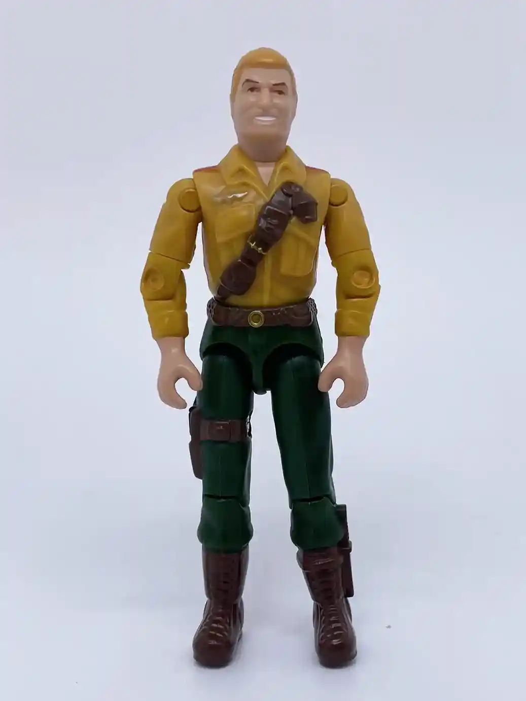 Unlike his vintage counterpart in more muted tans and greens, this new Duke figure is dressed in Sunbow Cartoon inspired colors. He is wearing a yellow military shirt with dark green pants. He has a brown chest strap with grenades and pockets on it. His shirt has gold wings and red shoulder accents. He is wearing a brown belt and has a brown side arm holster on his right leg. He is also wearing brown boots with a brown knife strapped to his left ankle. Duke looks amazing sporting all of his GI Joe The Movie inspired accessories. We will get into further detail on his accessories below.