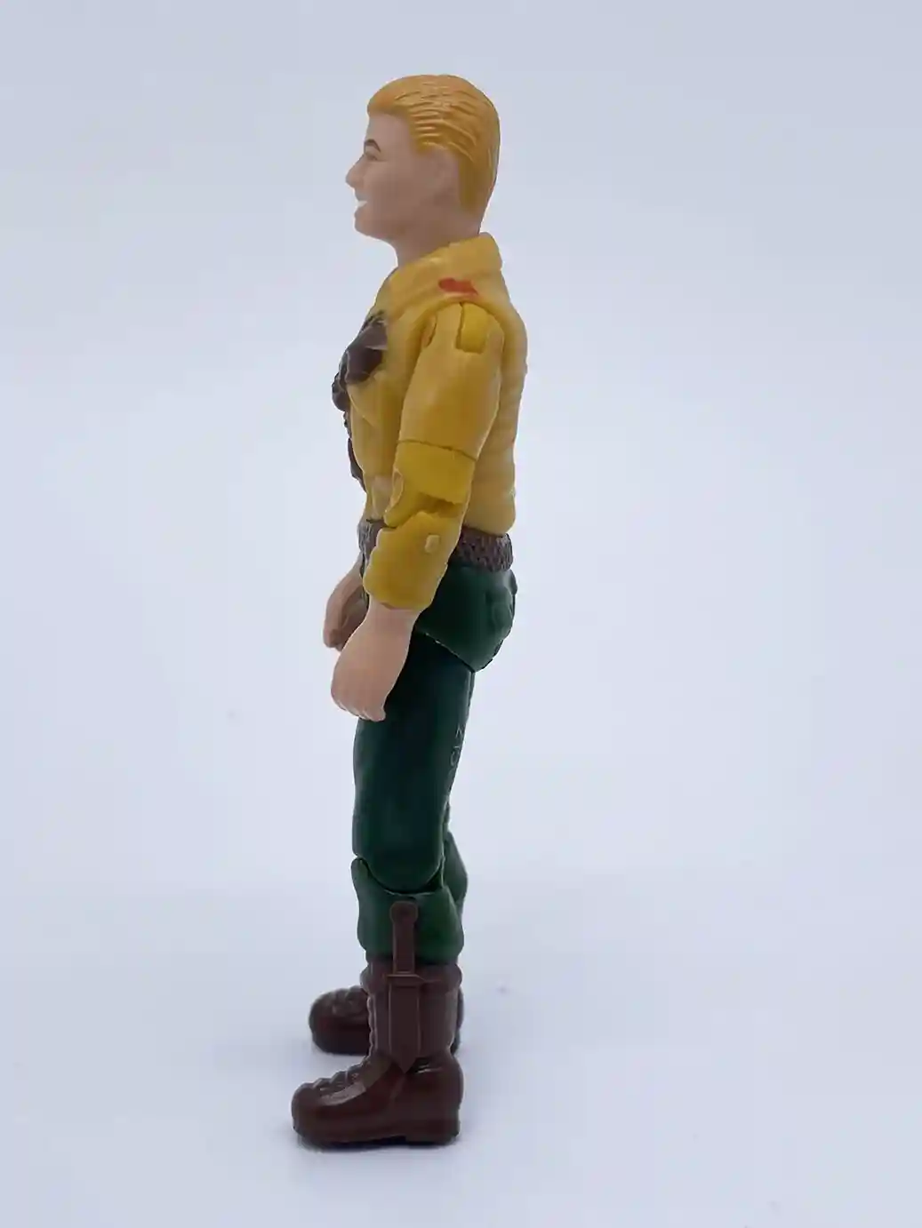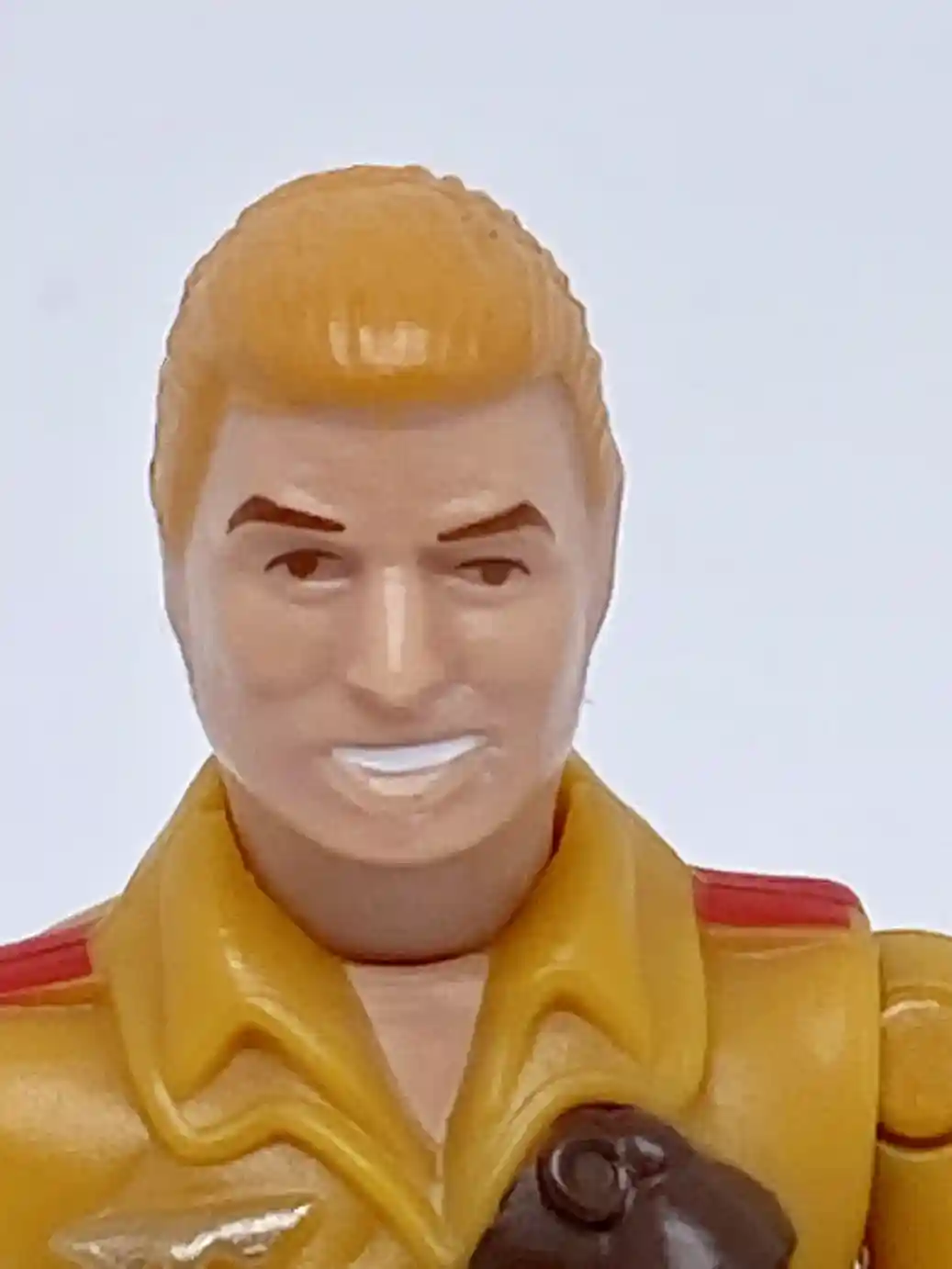 Duke’s head design is an all new sculpt, although very similar to the vintage action figure. This new retro version of Duke sports a combed back hair do and blonde hair. His skin tone is also darker than the vintage figure. Here you can see Duke has a smile on his face, but one glaring issue this new figure has is that his right eye and eyebrow look mis aligned to the ones on the left side on his face. It’s not just this sample as I have seen several reviews, all with the same issue. I don’t know if this was intentional or a manufacturing error. Perhaps they were trying to give Duke a raised eye brow look, like the image on his card back but it is coming across as a paint app error. In any case, besides the wonky eye, his head looks great.