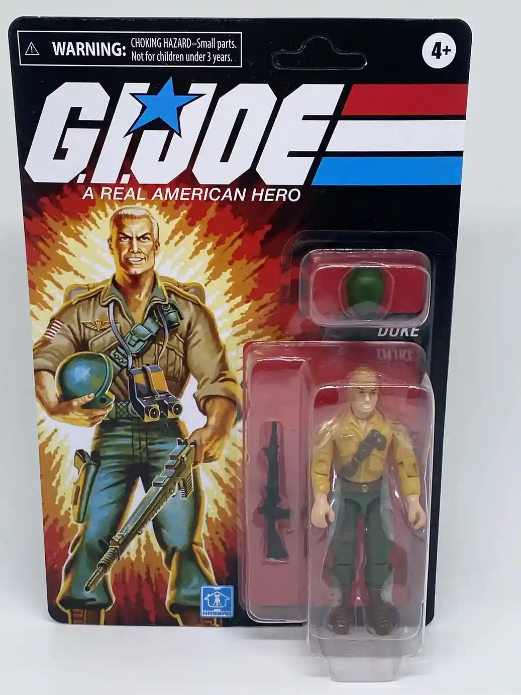 The original version of Duke was released in 1984 as part of Wave 2. The 1984 Duke figure only included his green machine gun, light green helmet, tan backpack and binocular accessories. you can see the new GI Joe Duke Retro O-Ring 2022 release is packaged with a black rifle rather than the green machine gun, and his dark green helmet. This is an odd choice for Hasbro since he came packed with the rest of his vintage inspired weapons in the cache box. The art work and logo on the new the Retro version resemble the vintage very closely and it’s hard to tell if it is the same artwork but just cleaned and brightened up. You will also notice that they have omitted the white piping around the edge of the card backs. The new card back is of a thicker and nicer quality than previous Retro O-Ring releases so that is a welcome improvement!