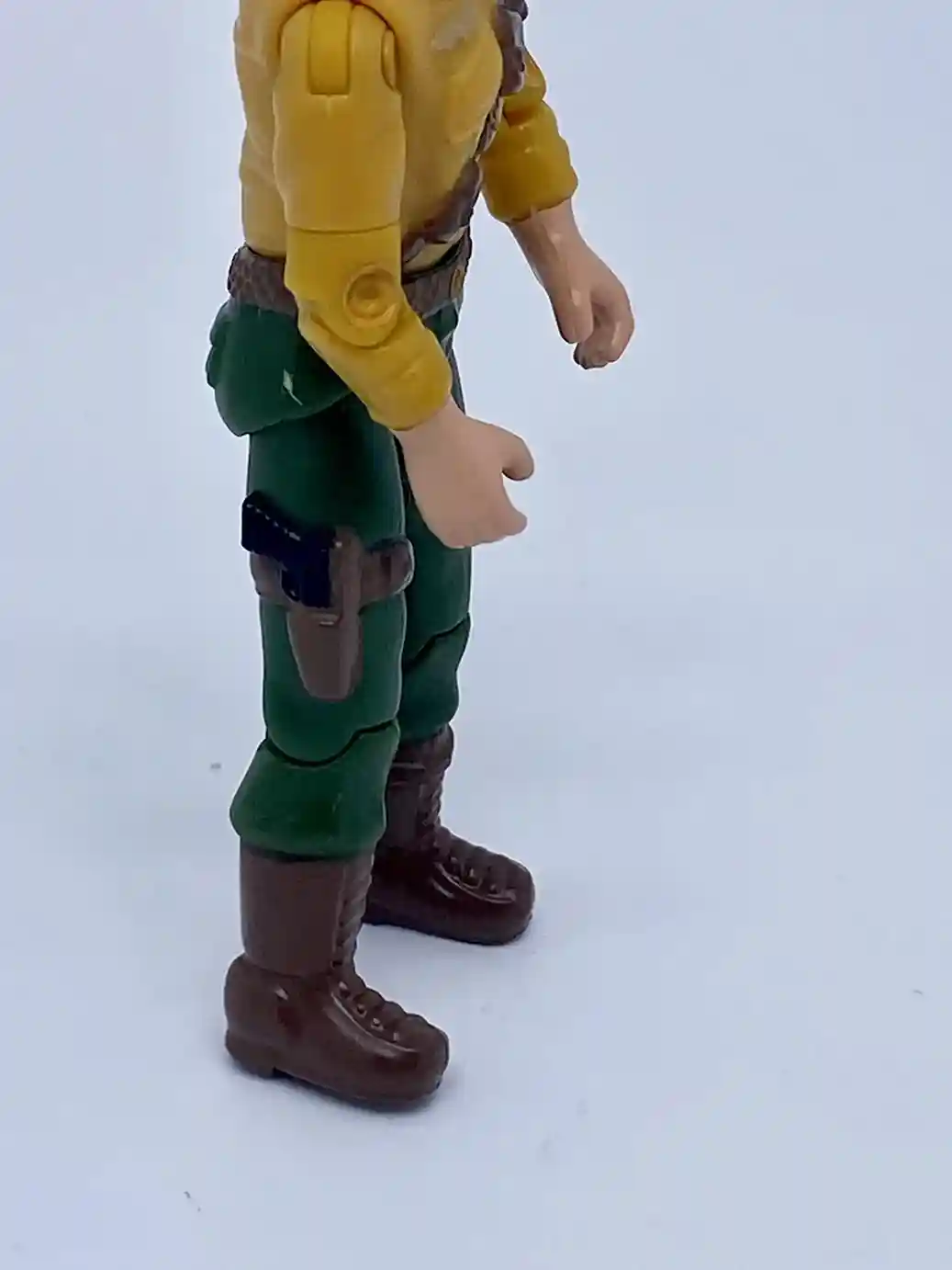 He is wearing dark green pants with a brown belt and gold belt buckle. He has 2 pockets on his rear side and is wearing a brown side arm holster with a molded black gun in it strapped to his right leg. He has on brown boots with a knife strapped to his left ankle