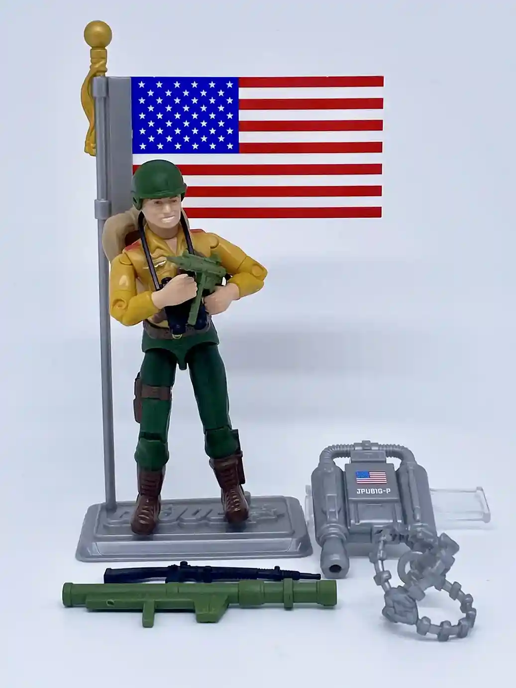 If you recall the opening sequence of the G.I. Joe The movie, Duke can be seen using a jetpack with silver straps on his chest, and he carries the American Flag up to the top of the Statue of Liberty. So these accessories are inspired by this scene in the movie. Then Duke comes with his vintage style green machine gun and his artwork inspired black rifle. Then it seems that Hasbro has an affinity for these big green bazooka’s so they packed that in with him as well. He also includes his vintage style green helmet and black binoculars.