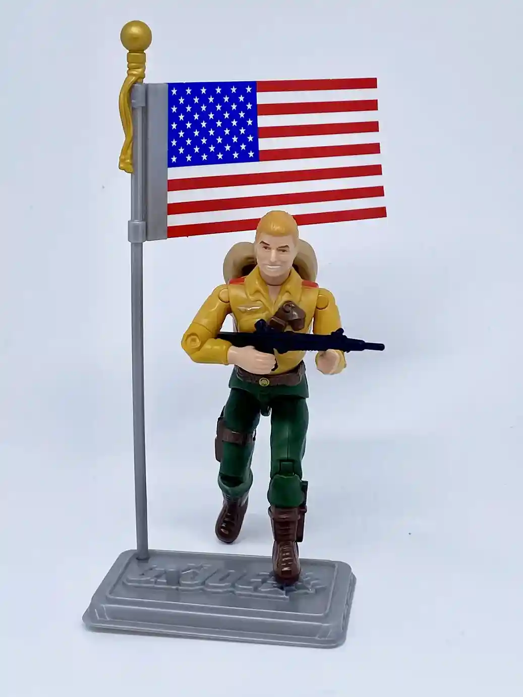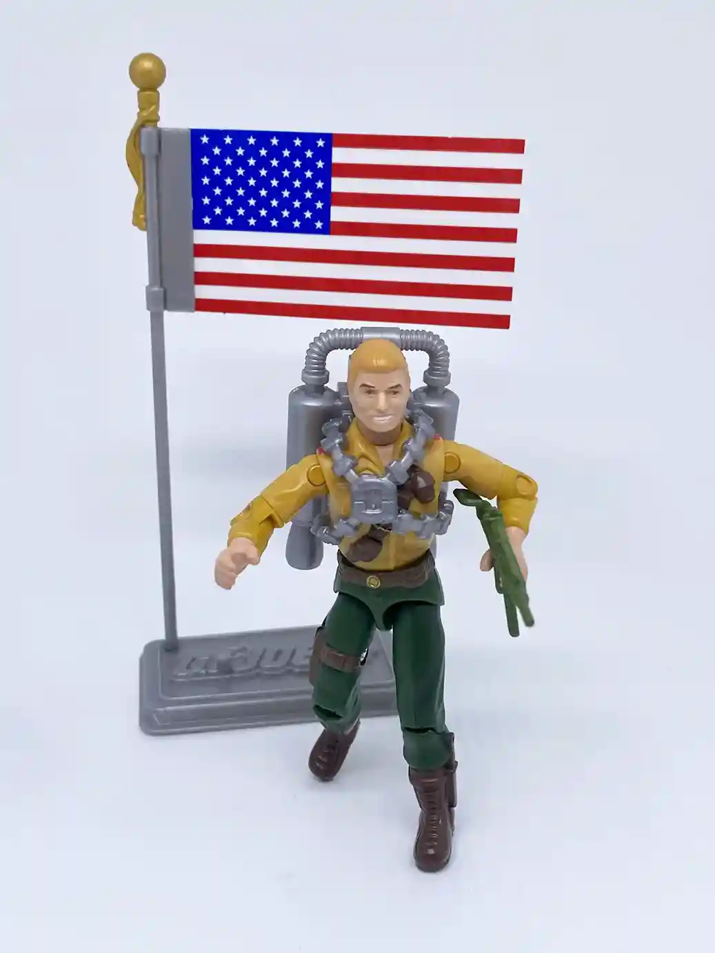 Unlike the rest of the retro O-Ring figures, Duke comes with a G.I. Joe 25th anniversary stand. It includes a hole on the right hand side to place the flag pole into so this is a nice added feature. The only issue with the reuse of this stand mold is that the foot peg holes are too far apart for you to place both of Duke’s feets into at the same time. You need to use on or the other. Not a big deal, but that I would point that out.