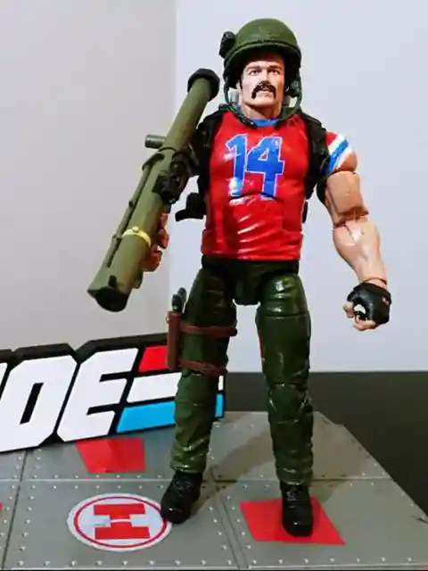Tiger Force Bazooka: Features tiger force pants, red removable helmet, upper sleeve slips over bicep, stepped look, some reused parts, brown belt, brown mustache, distressing on jersey logo with red “14” logo.