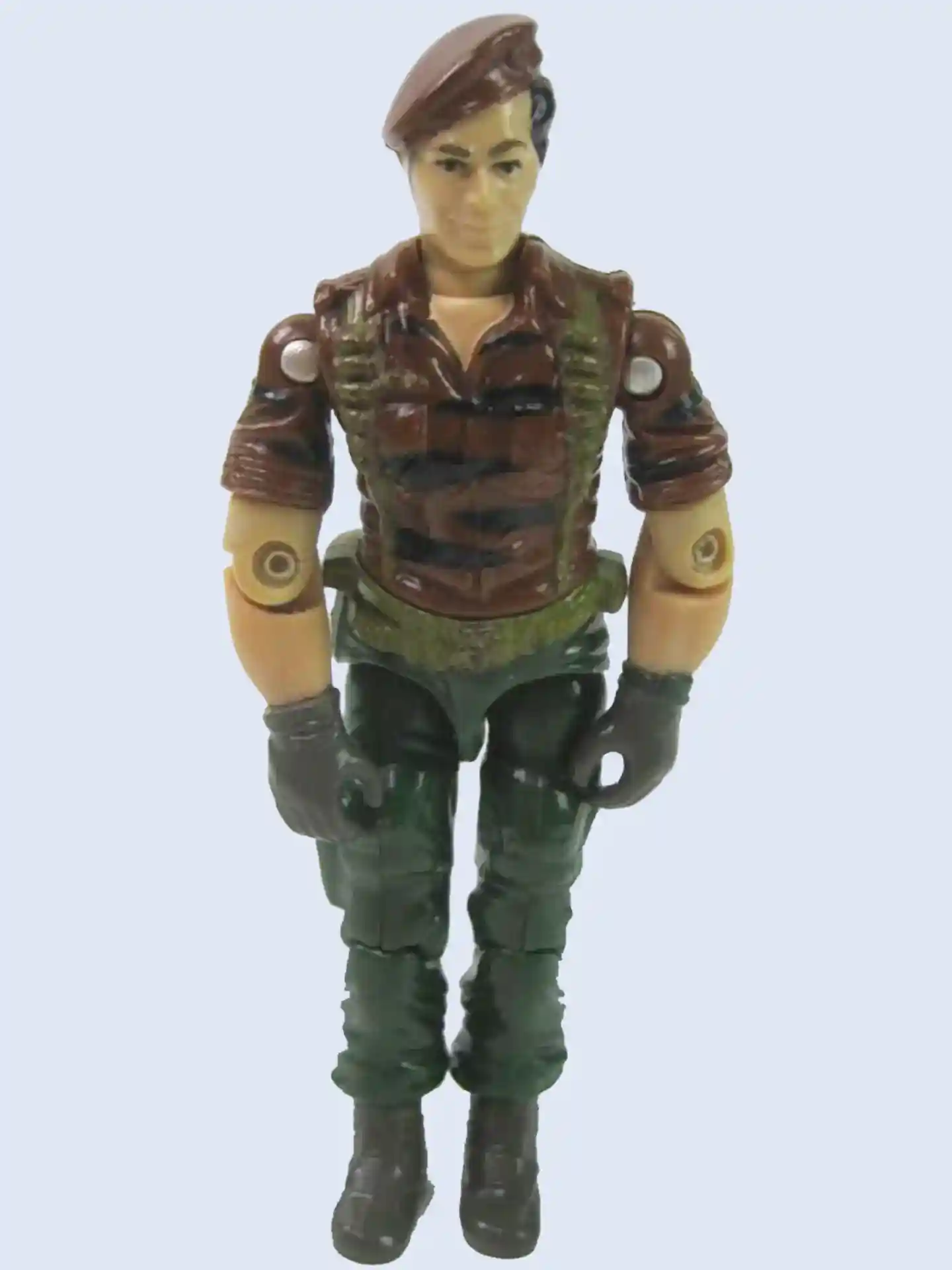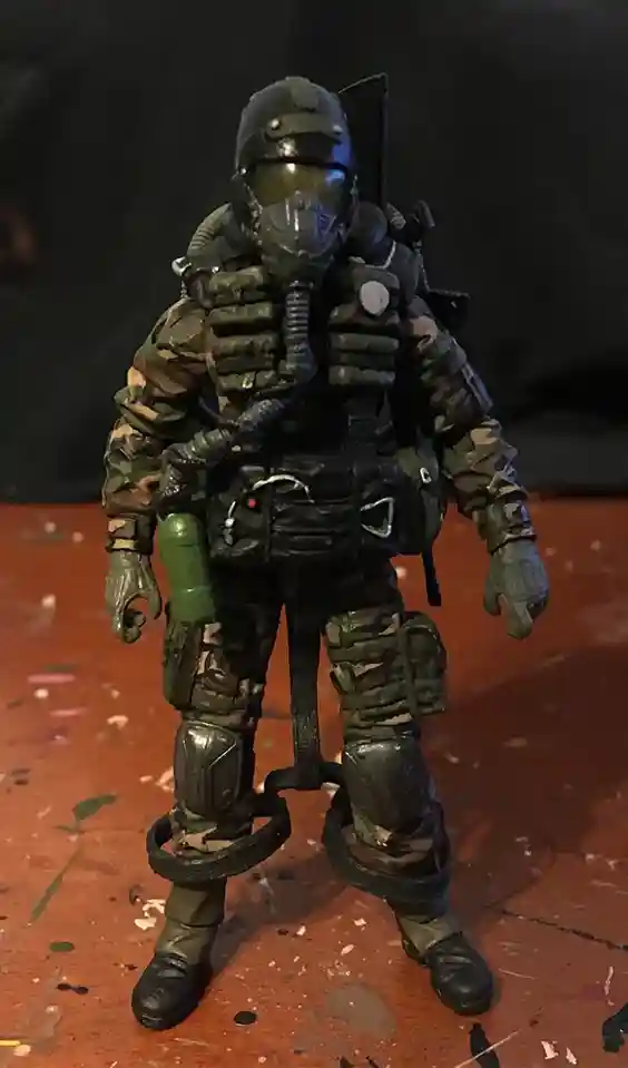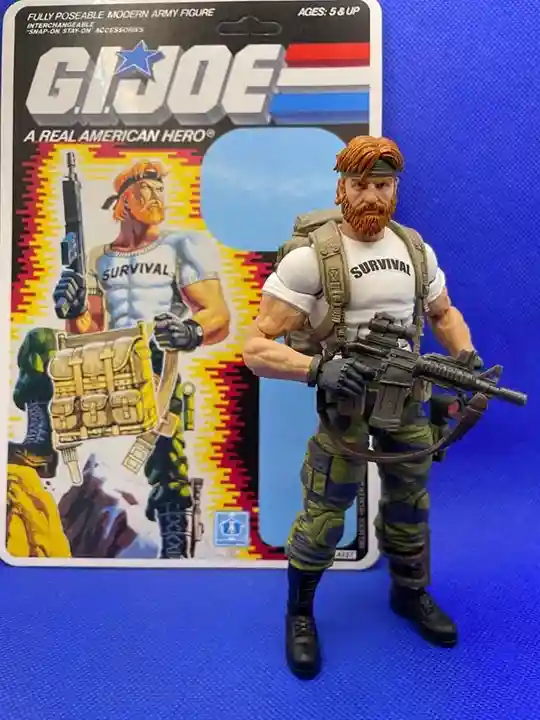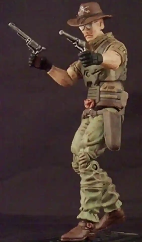 Tiger Force Recondo: Features a tan skin tone, sun kissed checks, handle bar mustache, black shirt, tiger force pants, blue Recondo removable hat, compass, backpack, and holster