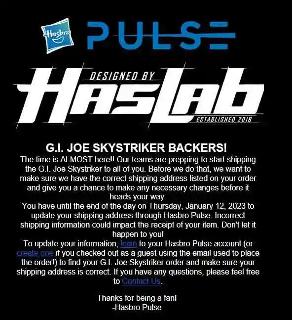 The time is ALMOST here!! Our teams are prepping to start shipping the G.I. Joe Skystriker to all of you. Before we do that, we want to make sure we have the correct shipping address listed on your order and give you a chance to make any necessary changes before it heads your way. You have until the end of the day on Thursday, January 12, 2023 to update your shipping address through Hasbro Pulse. Incorrect shipping information could impact the receipt of your item. Don’t let it happen to you! To update your information, login to your Hasbro Pulse account (or create one if you checked out as a guest using the email used to place the order!) to find your G.I. Joe Skystriker order and make sure your shipping address is correct. If you have any questions, please feel free to Contact Us.
