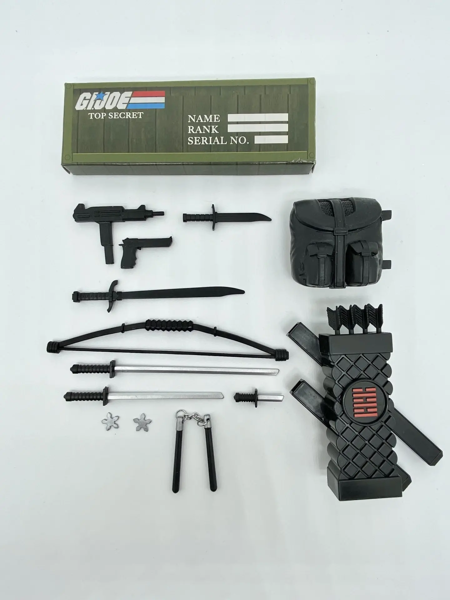 Snake Eyes and Storm Shadow come with a ton of accessories that come packed in a cardboard green ammo box labeled ‘Top Secret”. There is room on the front to fill in your own name, rank and serial number as well! How cool is that?