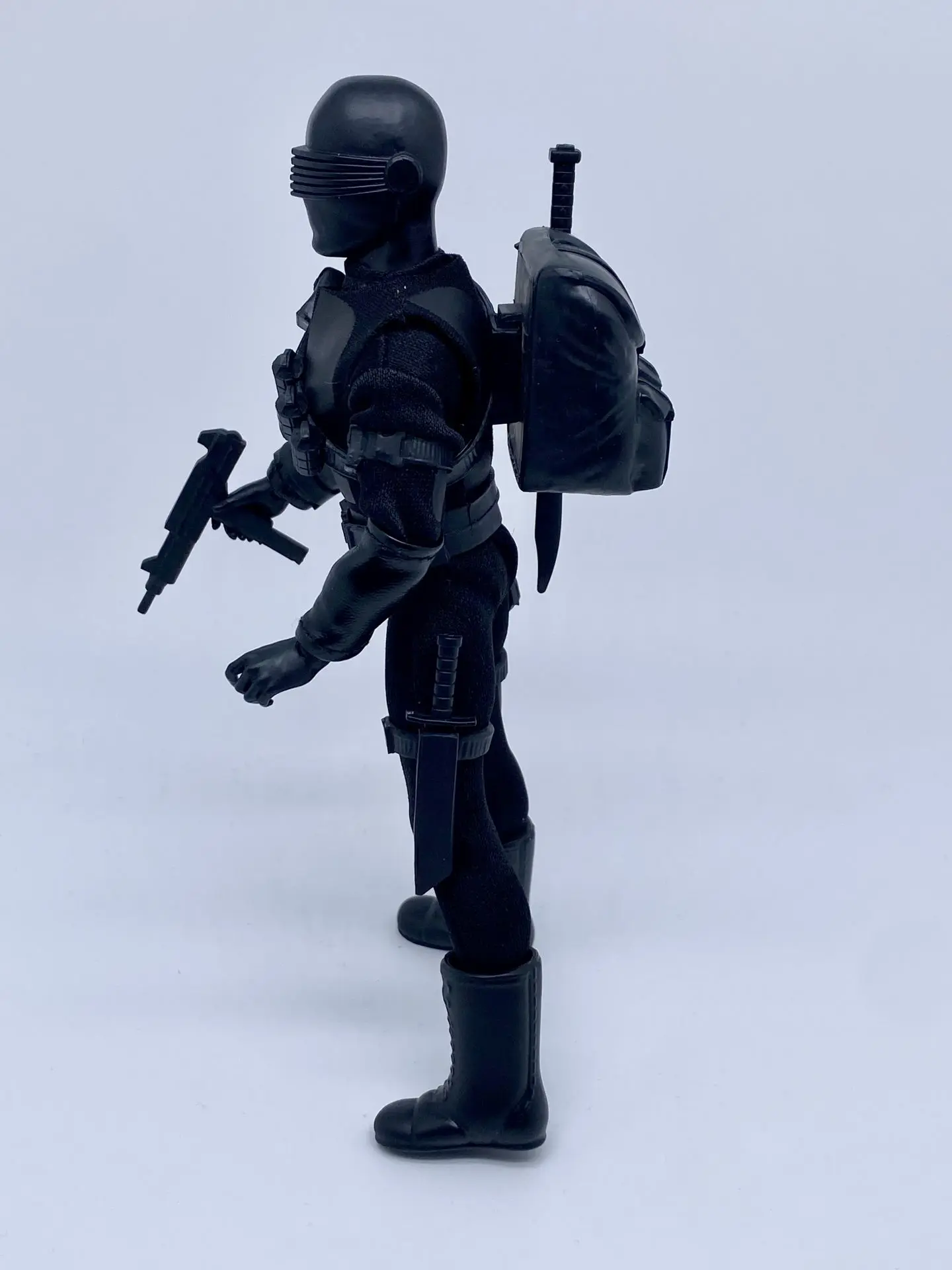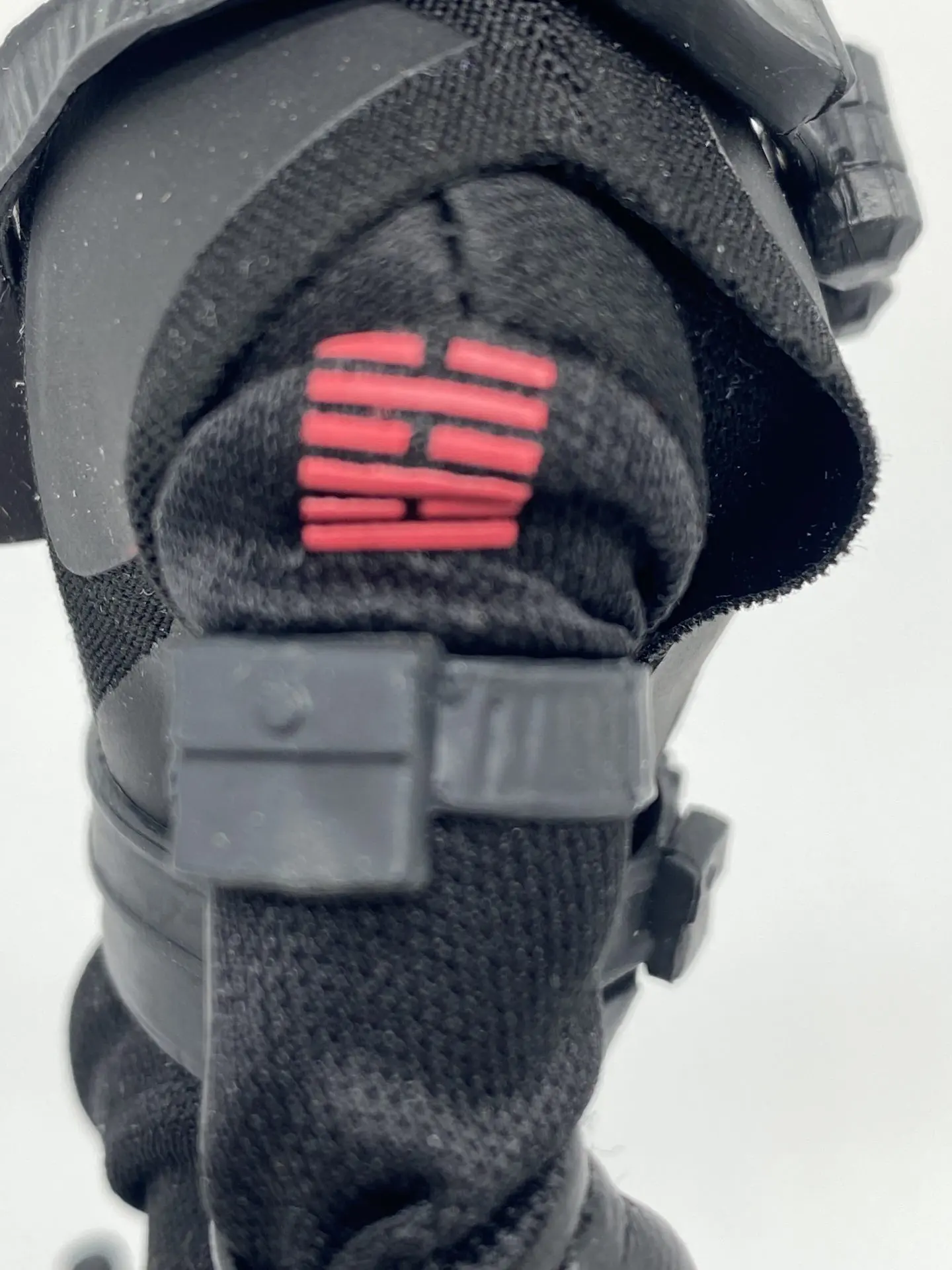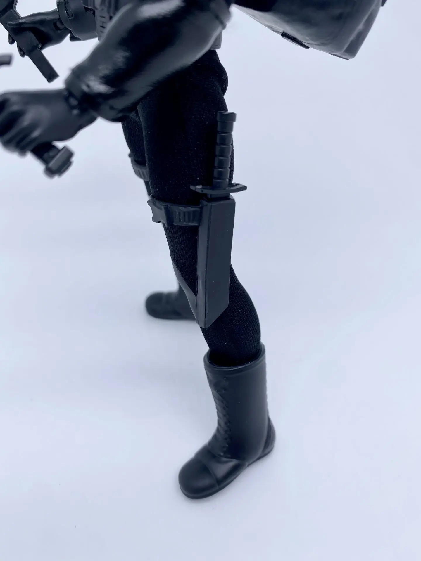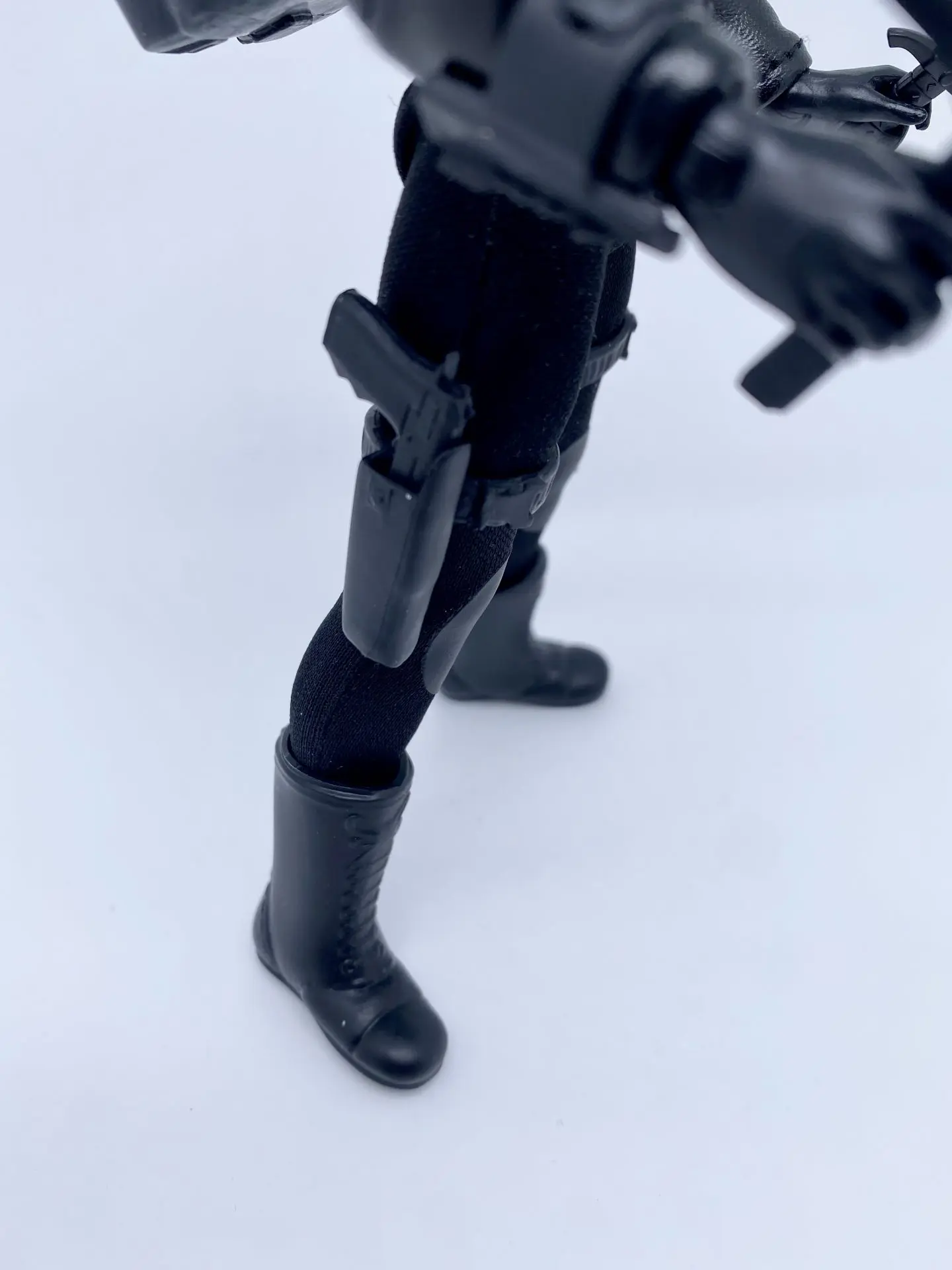 Snake Eyes comes packed with 2 weapons holsters strapped to his upper thighs. On his right leg is a holster to hold his Colt 45 Caliber Pistol. On his left leg is a knife holster. He has black soft plastic boots and leather like patches on his knees.