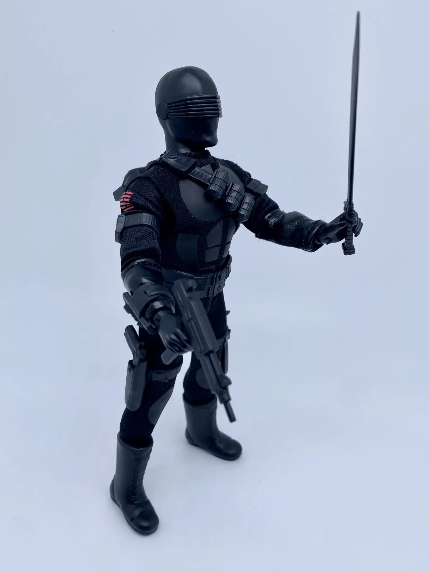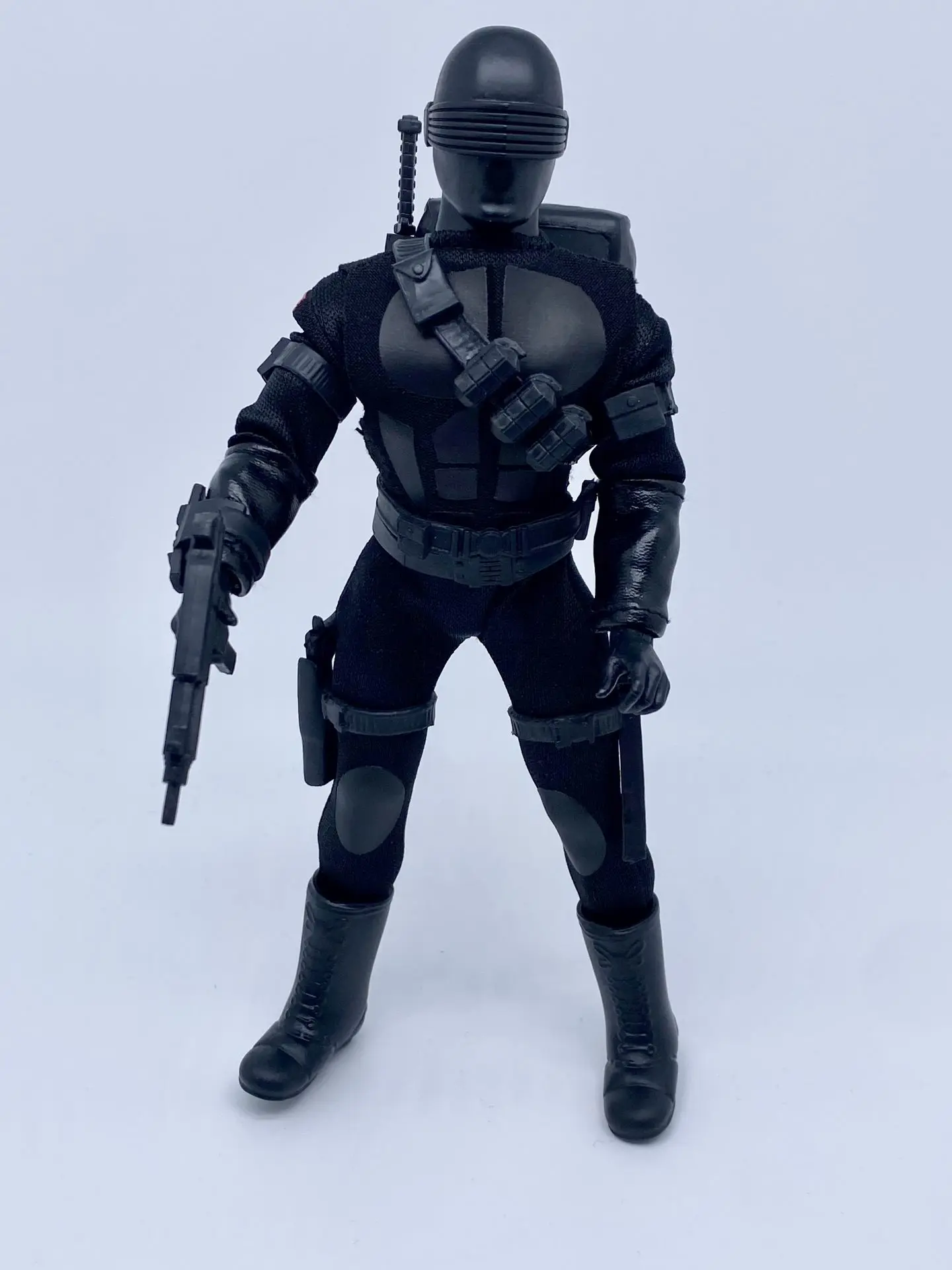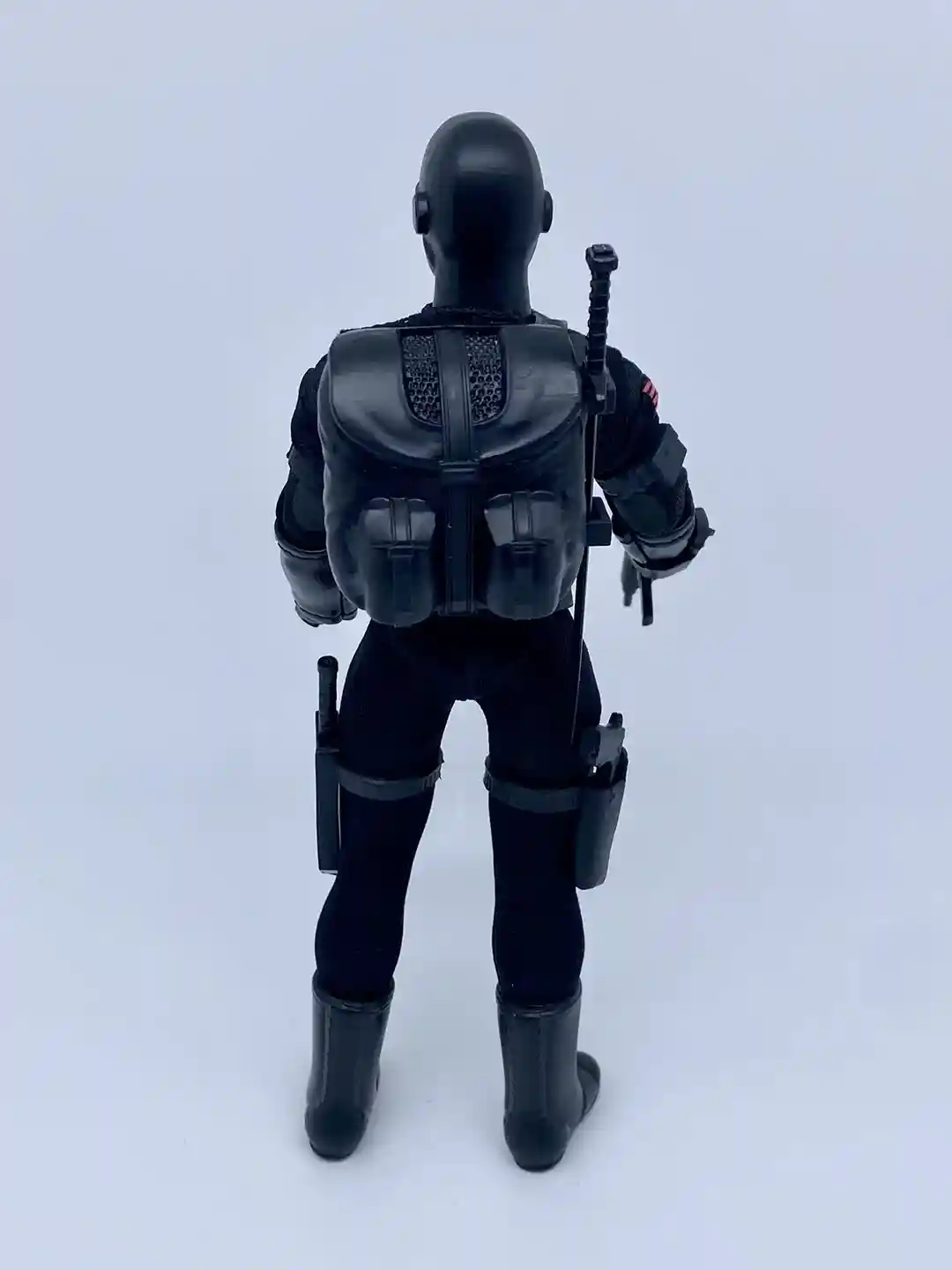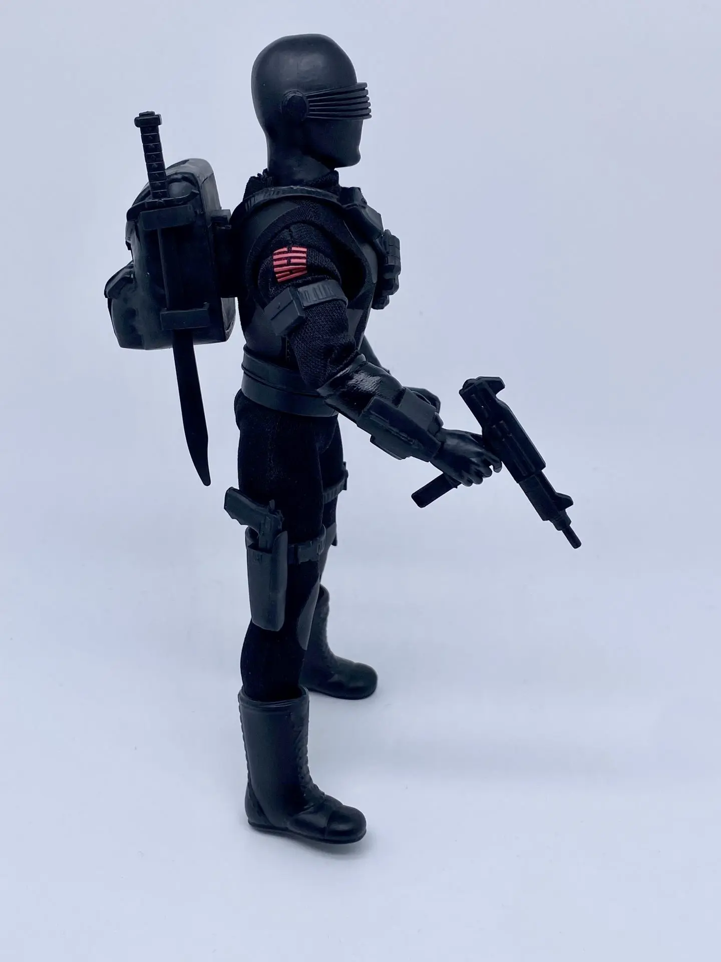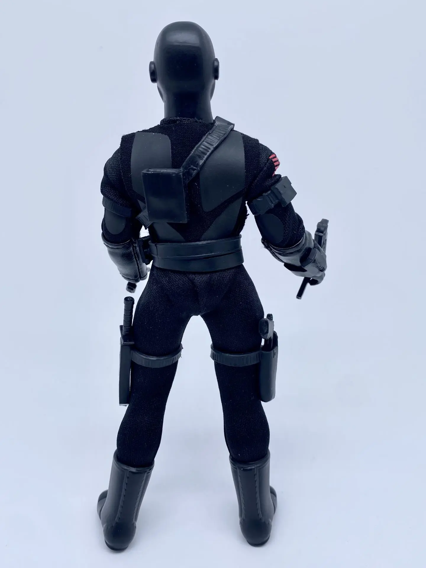 Snake Eyes comes packed with 2 weapons holsters strapped to his upper thighs. On his right leg is a holster to hold his Colt 45 Caliber Pistol. On his left leg is a knife holster. He has black soft plastic boots and leather like patches on his knees.