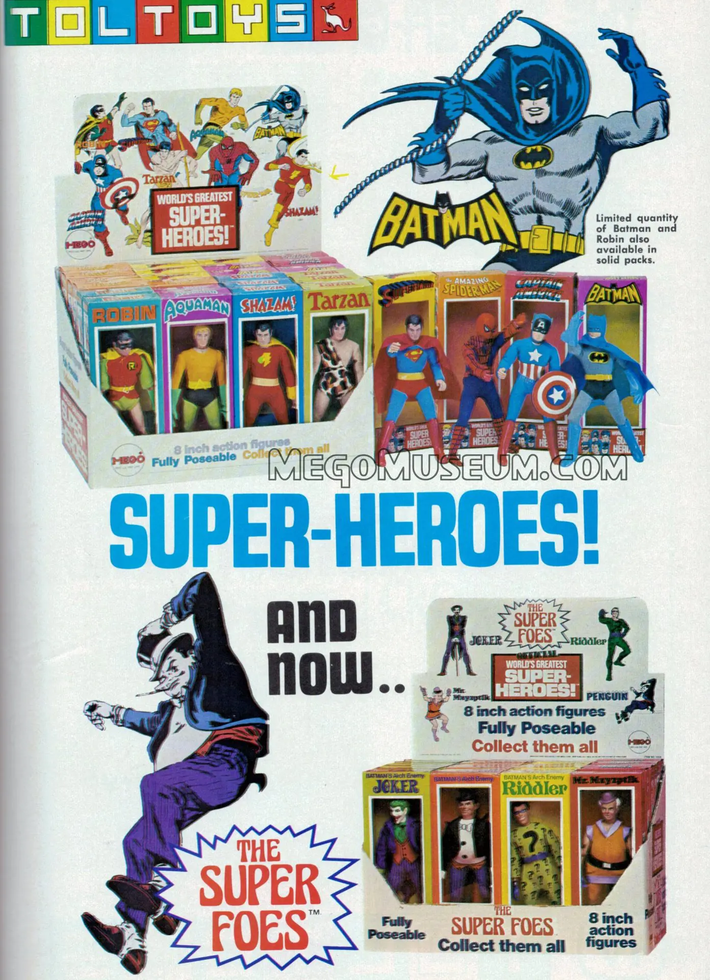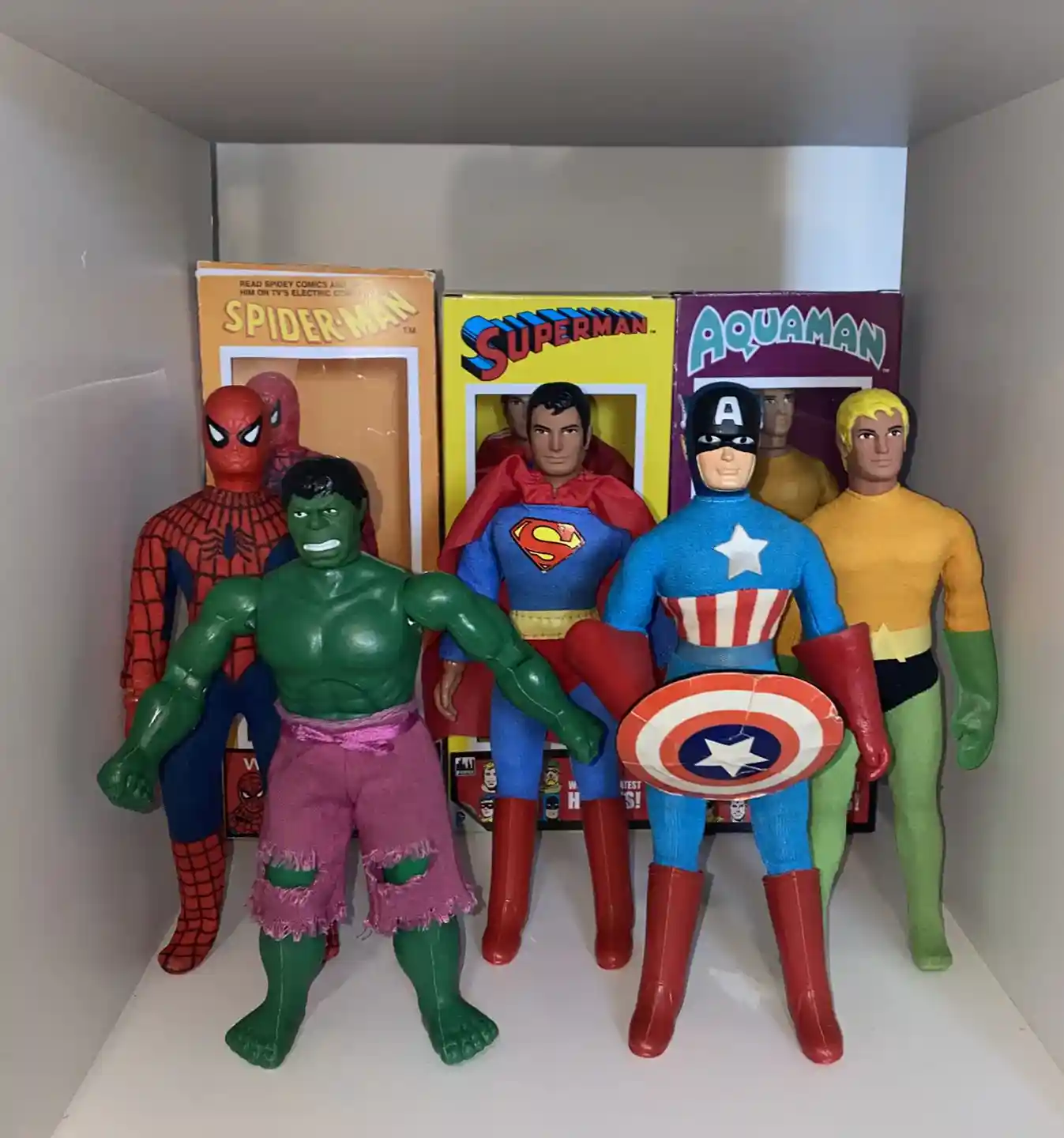 Mego action figures are a quintessential must have toy when it comes to collecting vintage action figures! Founded by David Abrams in 1954, Mego started out by selling cheap toys in dime stores. But in 1971, when Marty Abrams, David’s son joined the company, Mego started its journey into the history books of toys! Marty Abrams, who became President of Mego in 1971 after graduating college, totally changed the creative vision of the company and set them off in a whole new direction. Marty decided that he would buy the toy rights to movie characters, celebrities and comic book heroes; then create small action figures of them. The very first Mego Action figure to be released was Action Jackson. A whole line was developed for him, and then soon followed the most famous line of Mego Action Figures, The World Greatest Super Heroes! These are by far the most popular and sought after collectables of the entire run of Mego action figures! They included characters from both the DC and Marvel Universe, something you would never see in a toy line today. Characters like Spiderman, Superman, Batman, Aquaman, Captain America, Hulk, Thor, The Joker, The Penguin and many more! My favorite was always Spiderman as I loved his pose-ability, perfect 8″ scale and super cute soft goods outfit, like pajamas with feet!