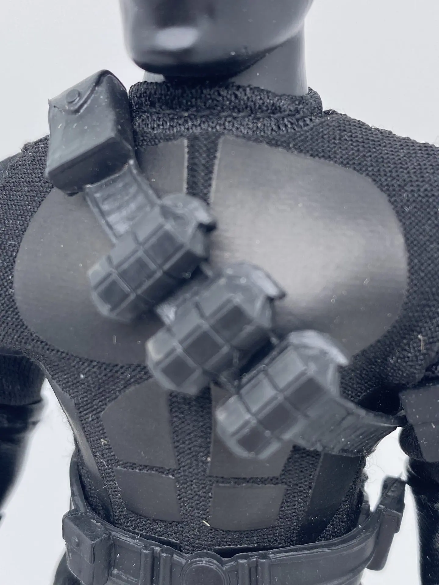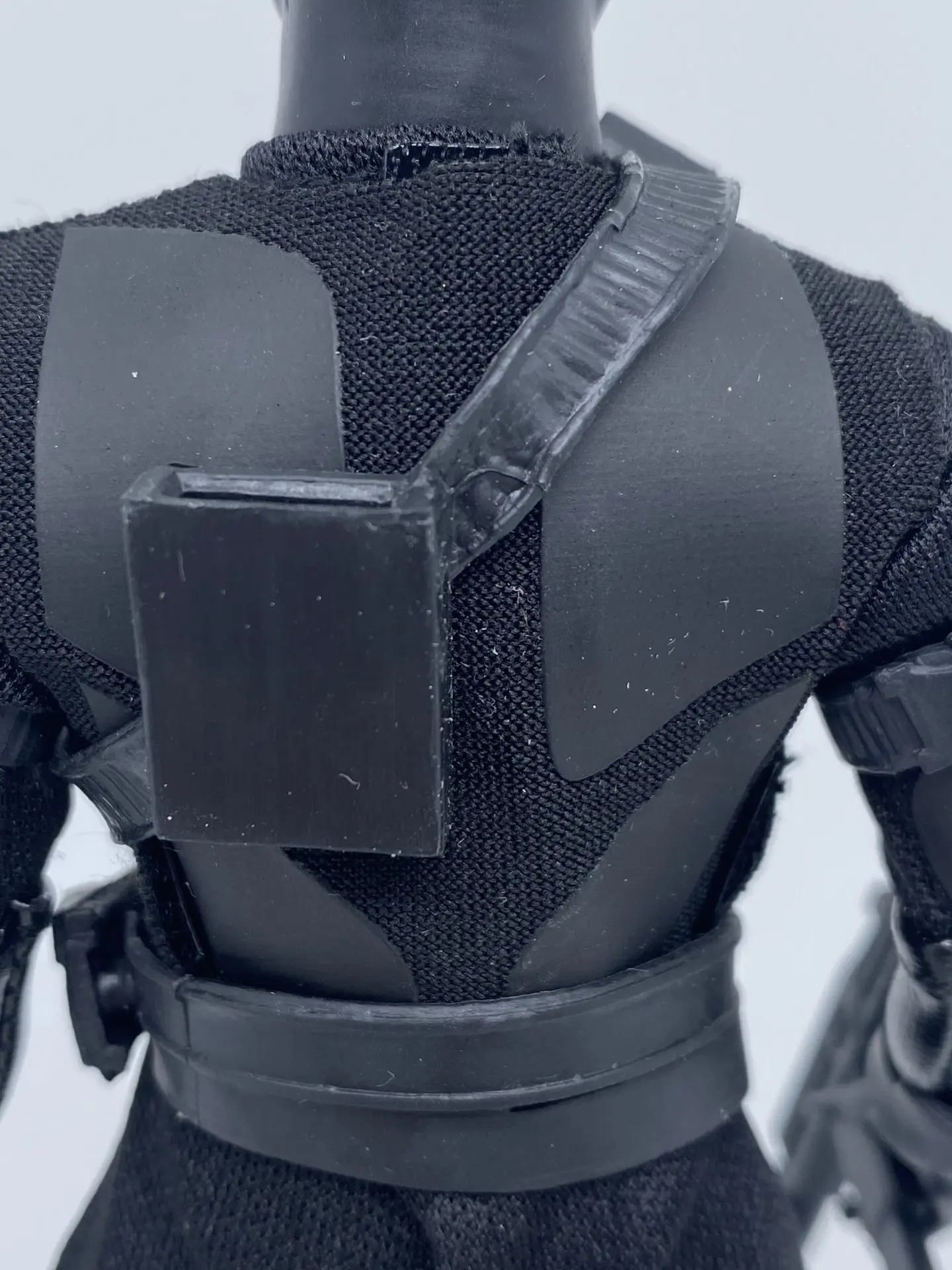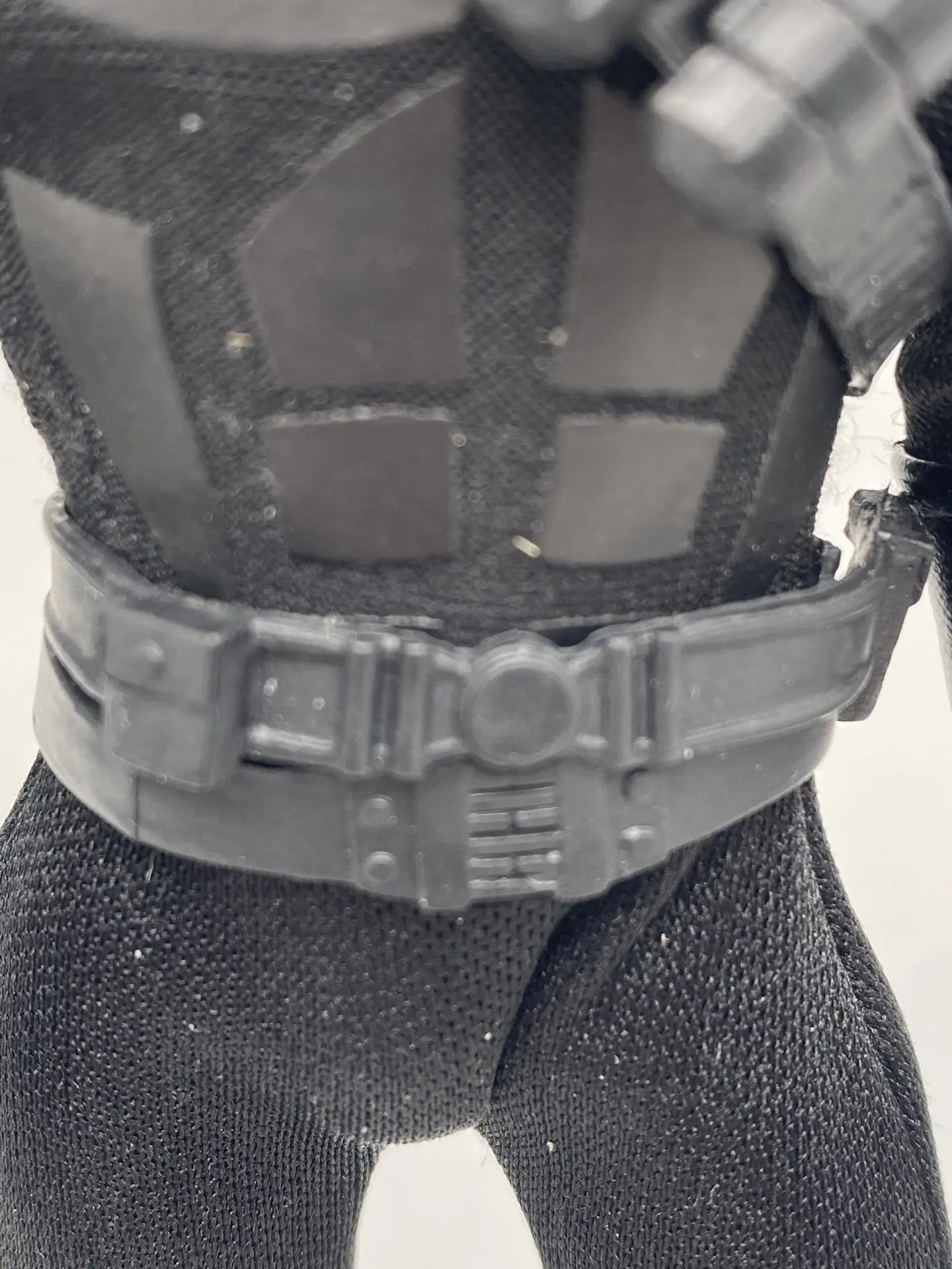 Snake Eye’s outfit is made of several various types of material. His chest has a several patches of leather like material sewn to the black leotard type material below to accent the chest and abs of the figure. He includes the aforementioned chest strap full of grenades and a pouch on top. The back of the chest strap has a larger molded plastic holster to hold his backpack secure to his back. Around his waist is a multi-layered belt with several different molded buckles and straps.
