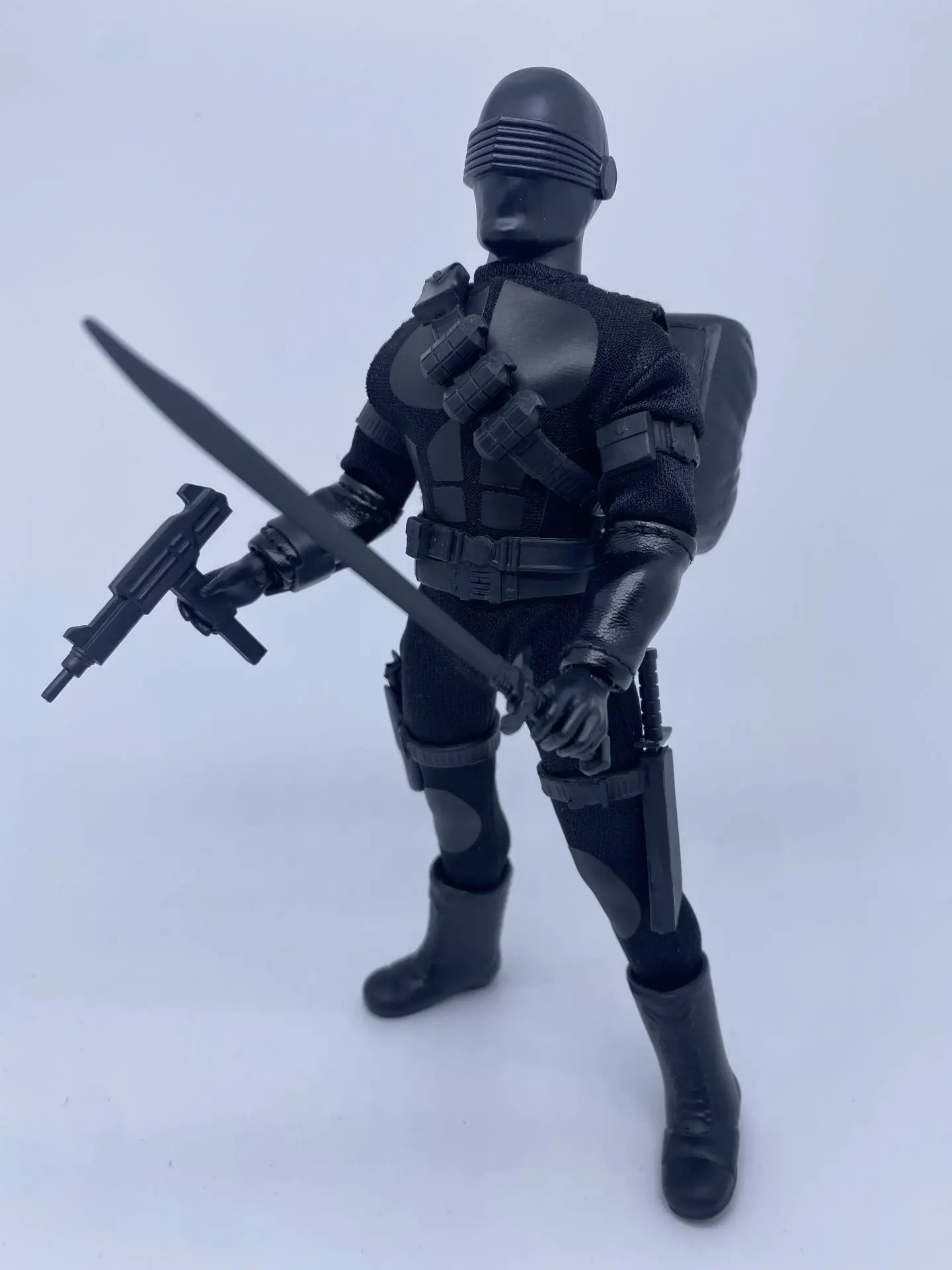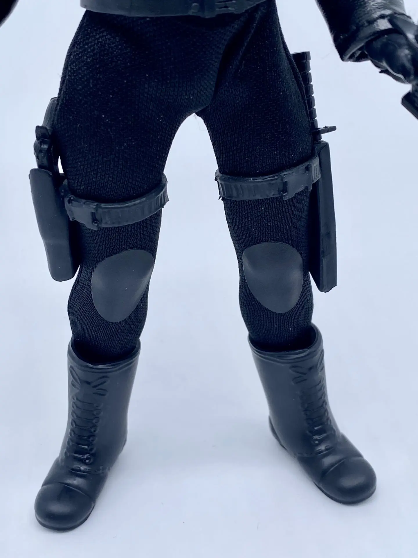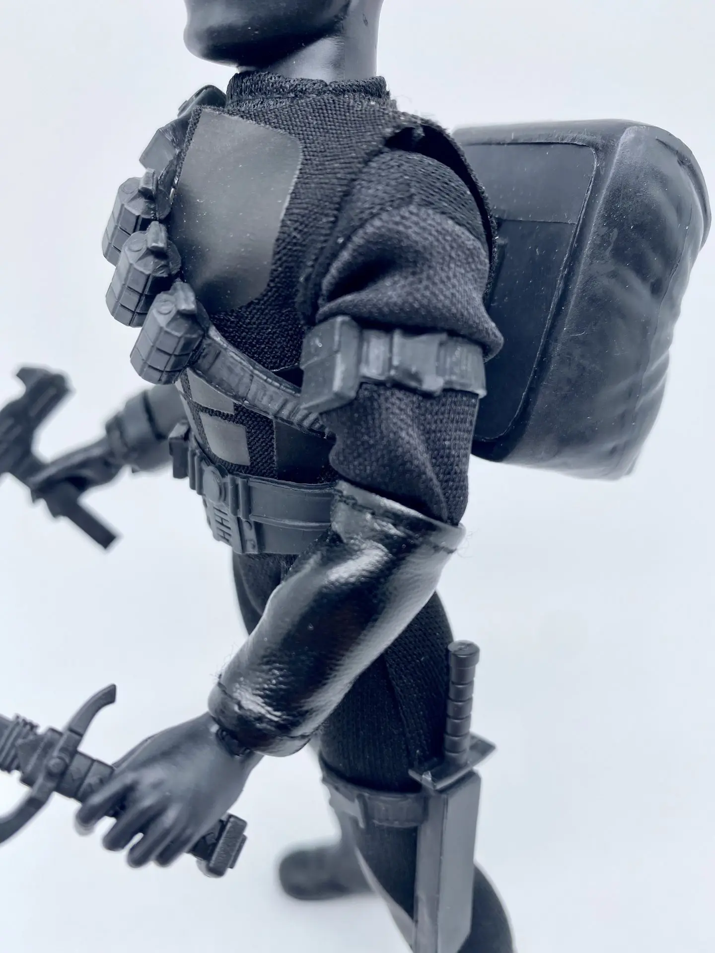 This Mego version of Snake Eyes is a wonderful interpretation of the Commando Snake Eyes, v2 A Real American Hero vintage 3-3/4″ O-Ring figure! From the black visor on his face mask to the grenades strapped to his chest, to the red Arashikage logo on his shoulder, this all black outfitted Mego Snakes Eye is totally RAD! The Mego Corporation hit a home run with Snake Eyes’s outfit. With the varying materials and shades of black, his outfit has a lot of interesting details. With various belts, arms bands, straps, and holsters, this Snake Eyes is ready for action! And of course, Snake Eyes comes packed with all his classic weapons as well, which we will cover below.