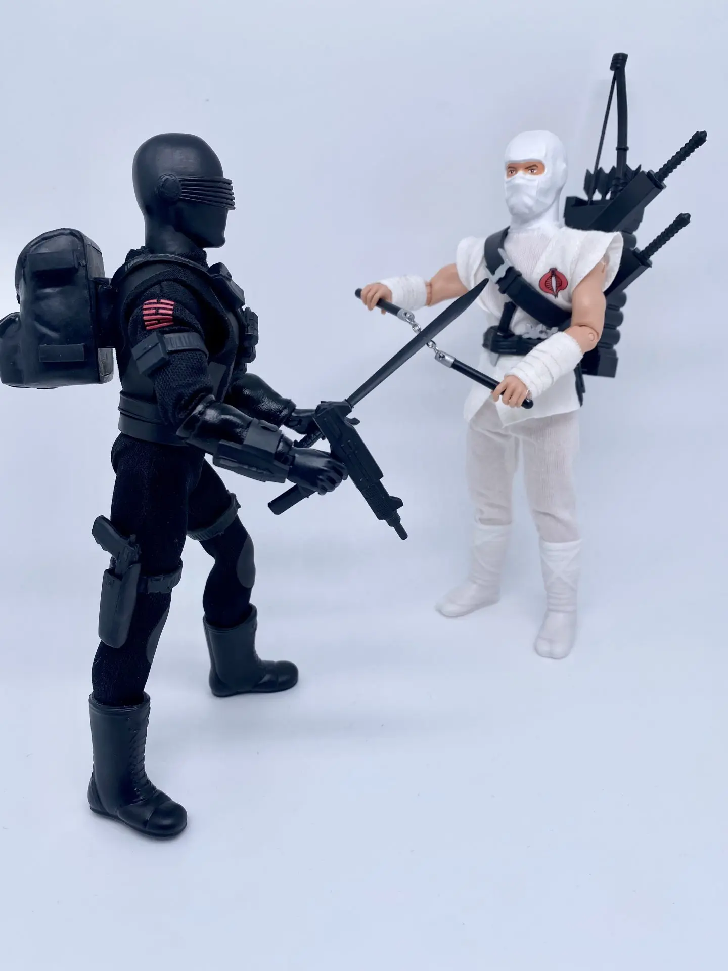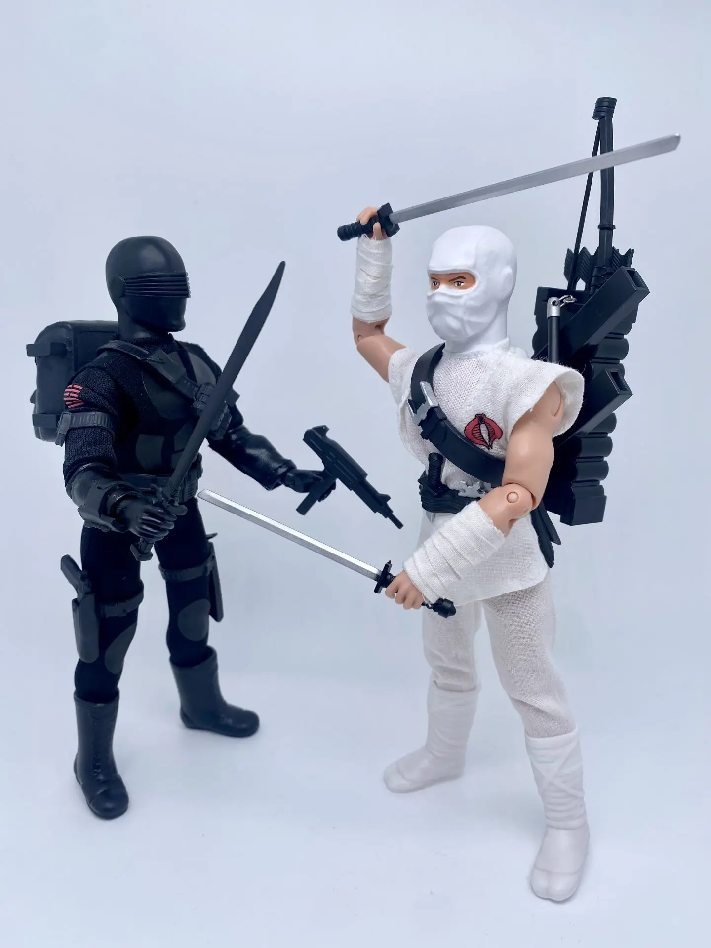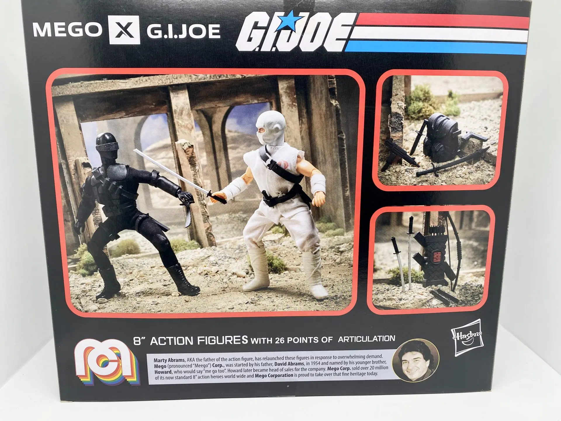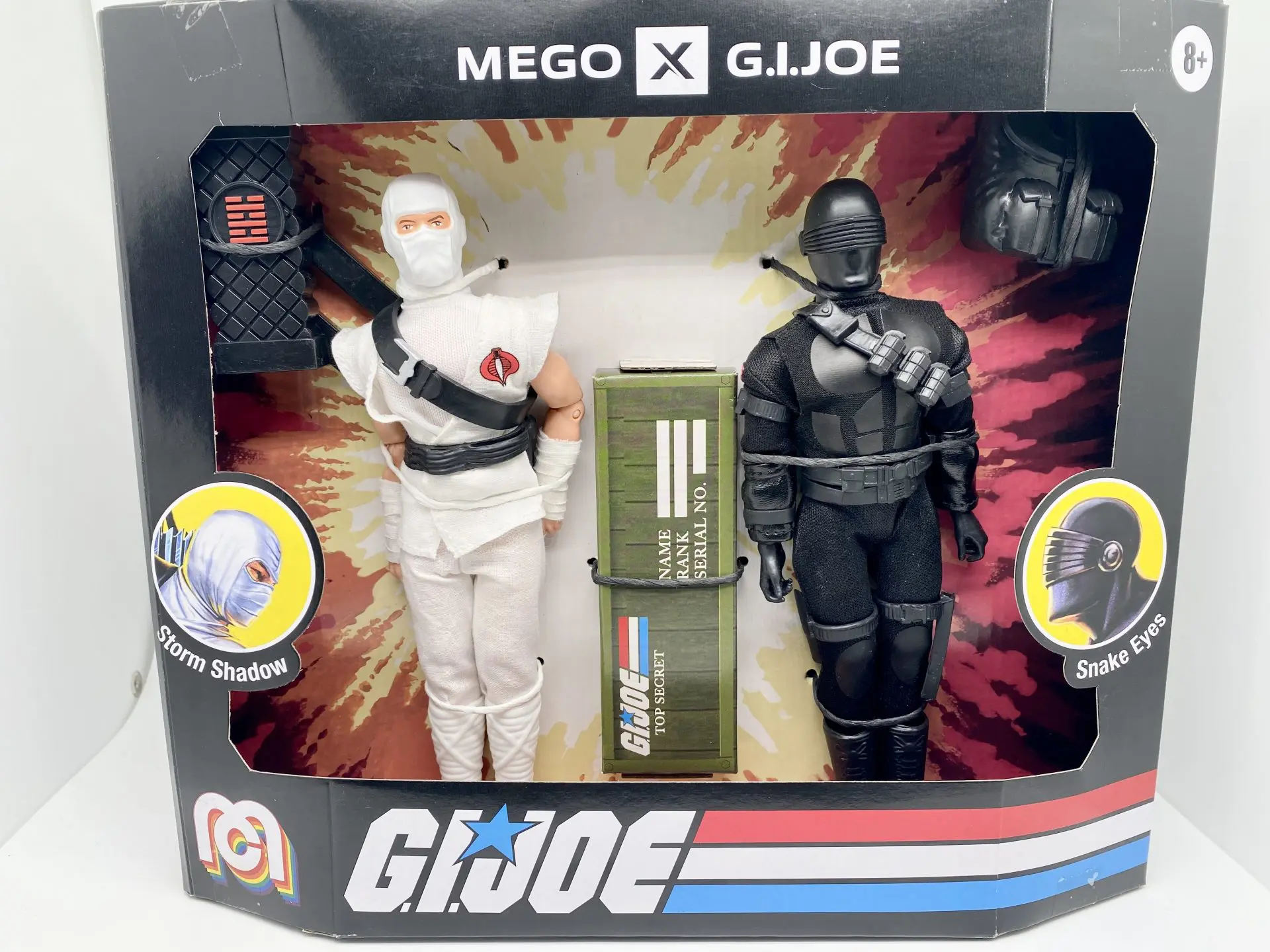 Mego Corporation and Hasbro have teamed up together to bring you this legendary Ninja rivalry in classic 8″ Mego Action Figure Form!Introducing the GI Joe Mego X Ninja Rivals Snake Eyes & Storm Shadow 2-Pack!