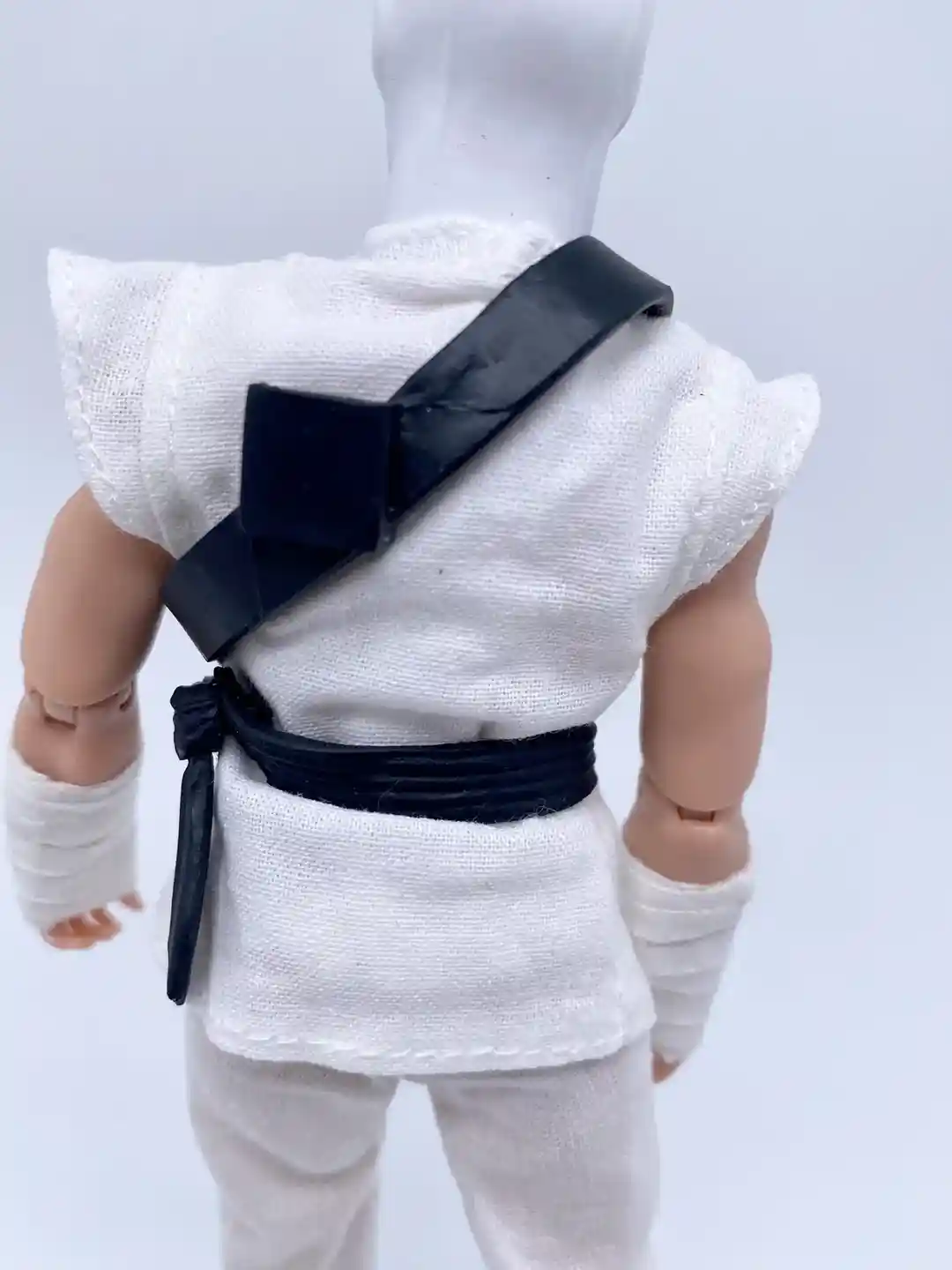 He includes a chest strap and belt which house his knife and ninja stars. The back of the chest strap has a holster to hold the clip of his backpack. His entire outfit front to back is a perfect Mego interpretation of the 3-3/4″ Vintage ARAH O-ring figure we all know and love!