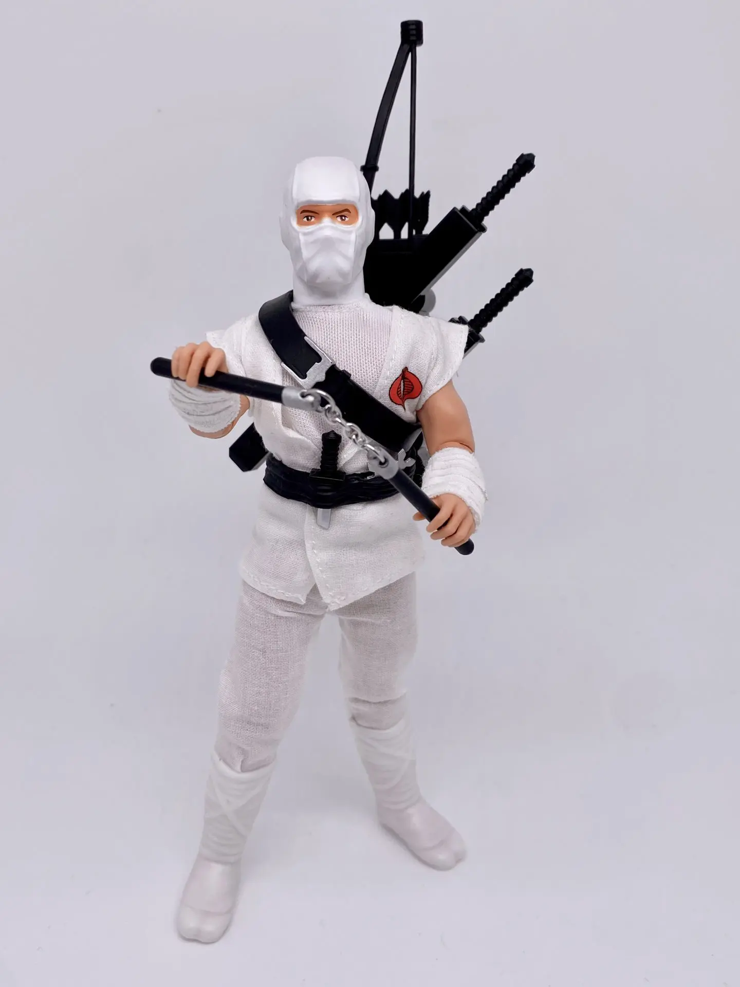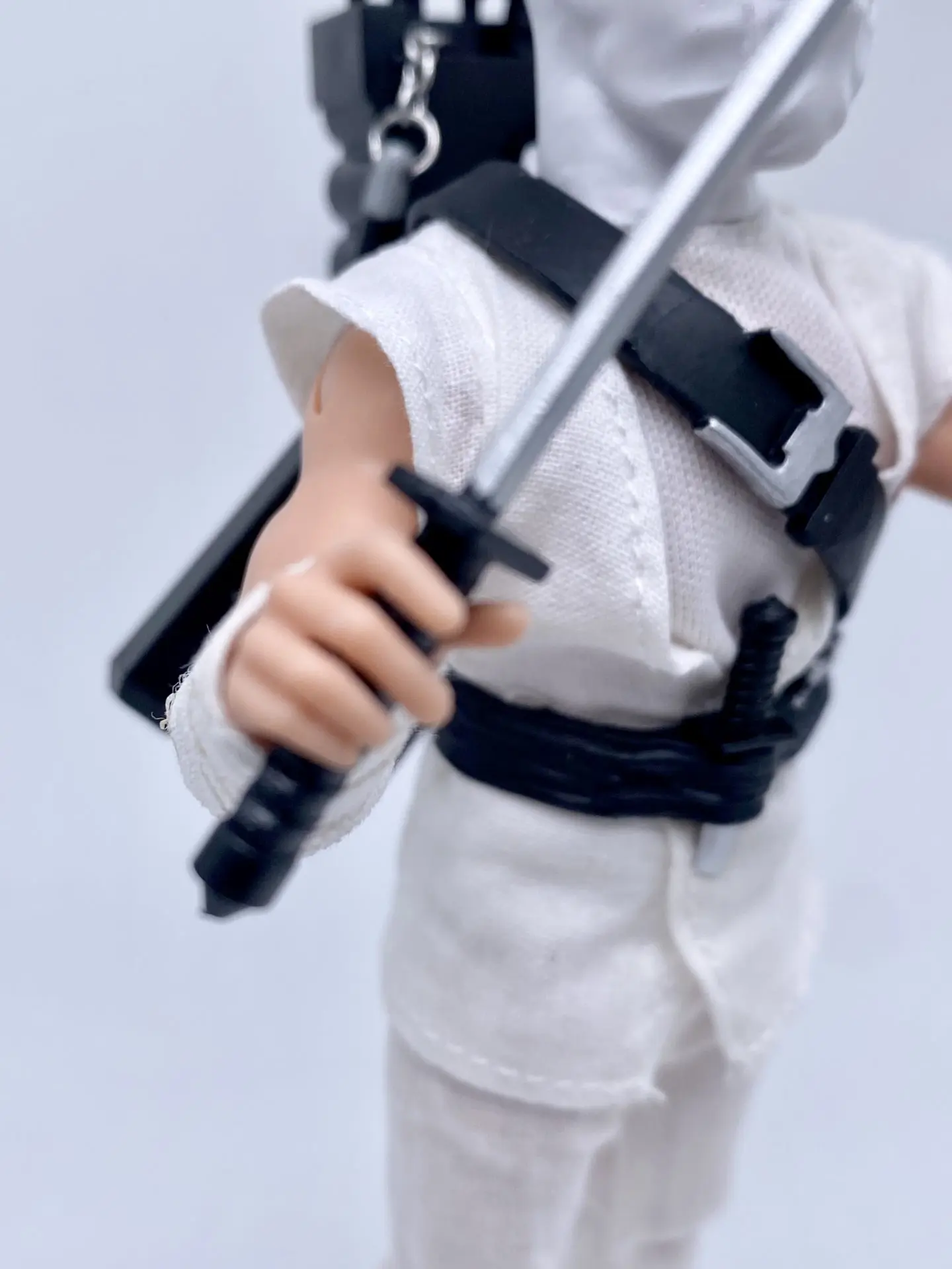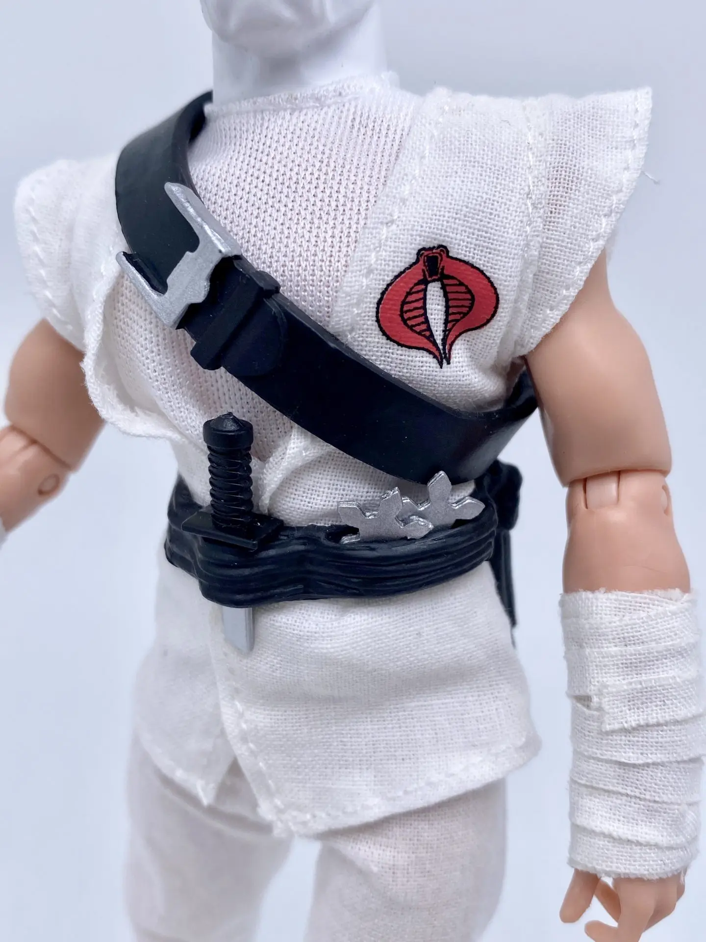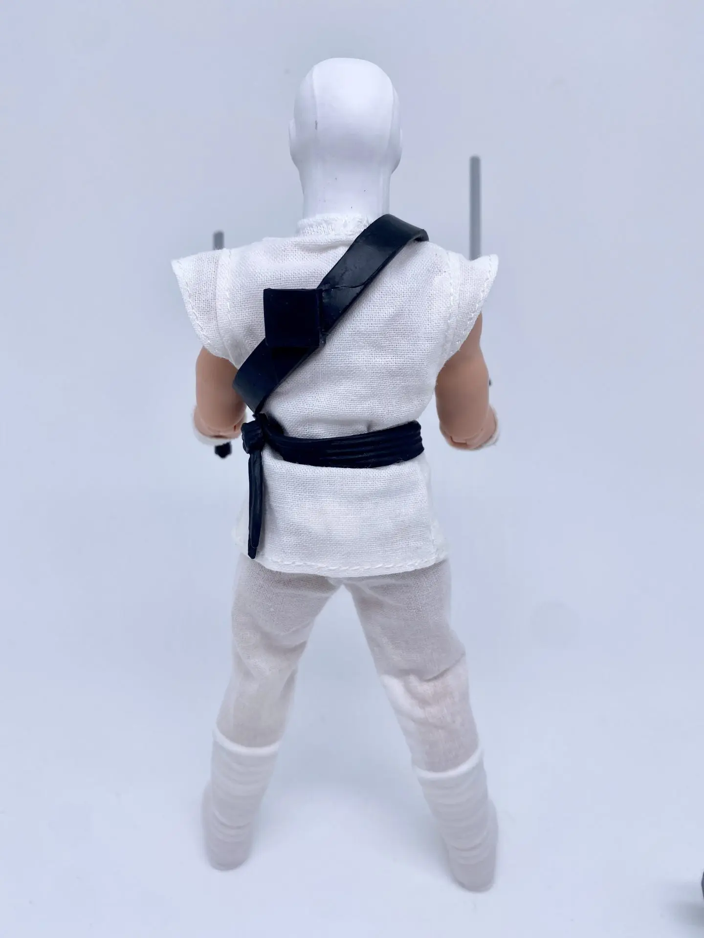 Storm Shadow is executed beautiful in the most classic A Real American Hero Mego style you could very ask for! This classic version of Storm Shadow is the perfect blend of Mego GI Joe crossover! Dressed in a gorgeous soft goods white Ninja Gi, you can see the beautiful job Mego did recreating Storm Shadows ARAH outfit! Complete with cut off sleeves, a red Cobra logo on the left chest and a layered textured shirt underneath, Storm Shadows outfit looks stunning! The stitching is beautifully done, and the quality of the soft goods outfit is outstanding! His pants are of a similar soft goods material and his boots are a flexible plastic. His wrists are wrapped in soft goods material as well, giving him a realistic Ninja look! I absolutely love this version of Stormie! Being such a vintage Mego fan, this is now my favorite modern interpretation of the vintage Storm Shadow by far! Storm Shadow also came packed out with all his classic accessories which we will cover below.