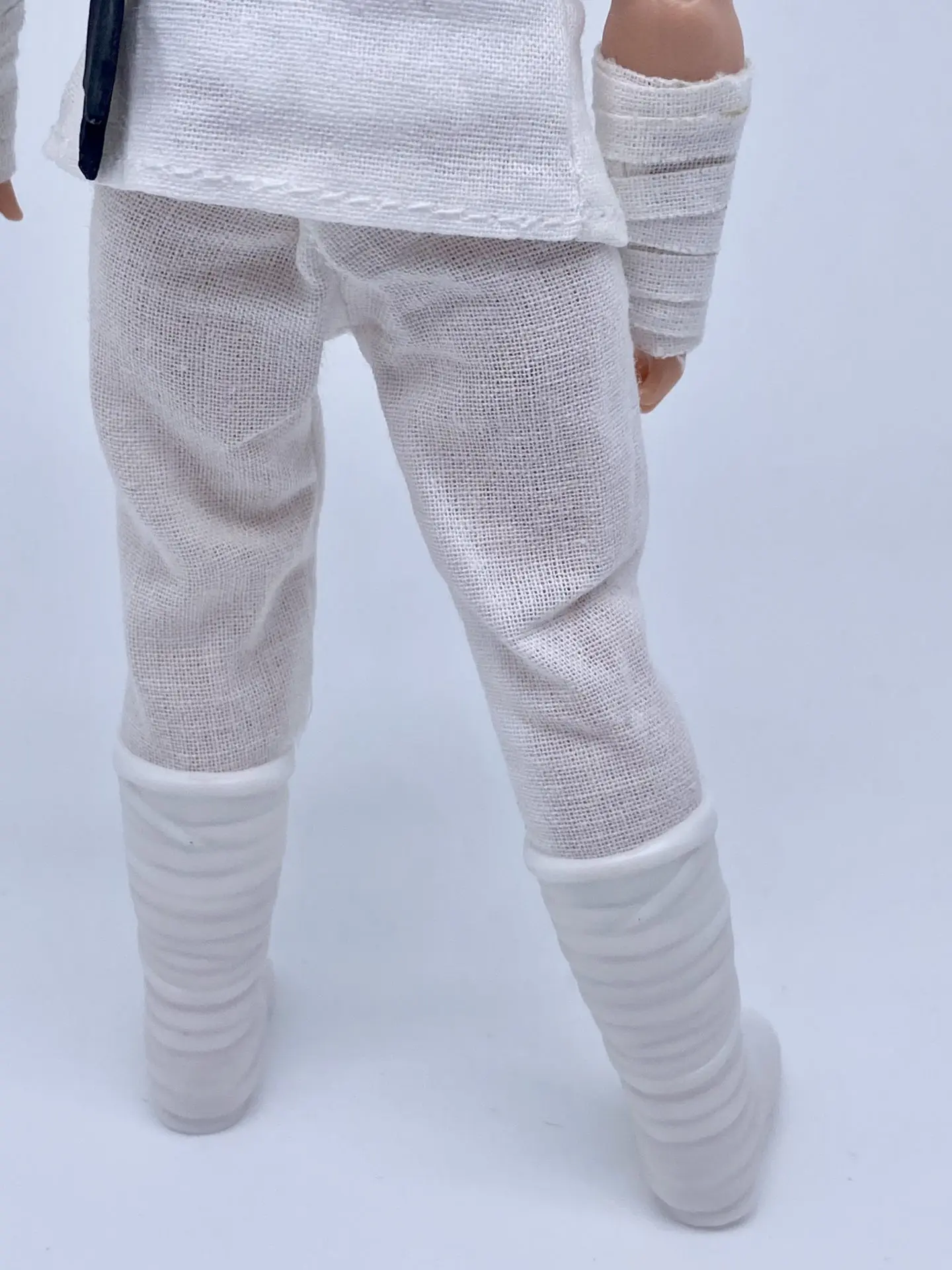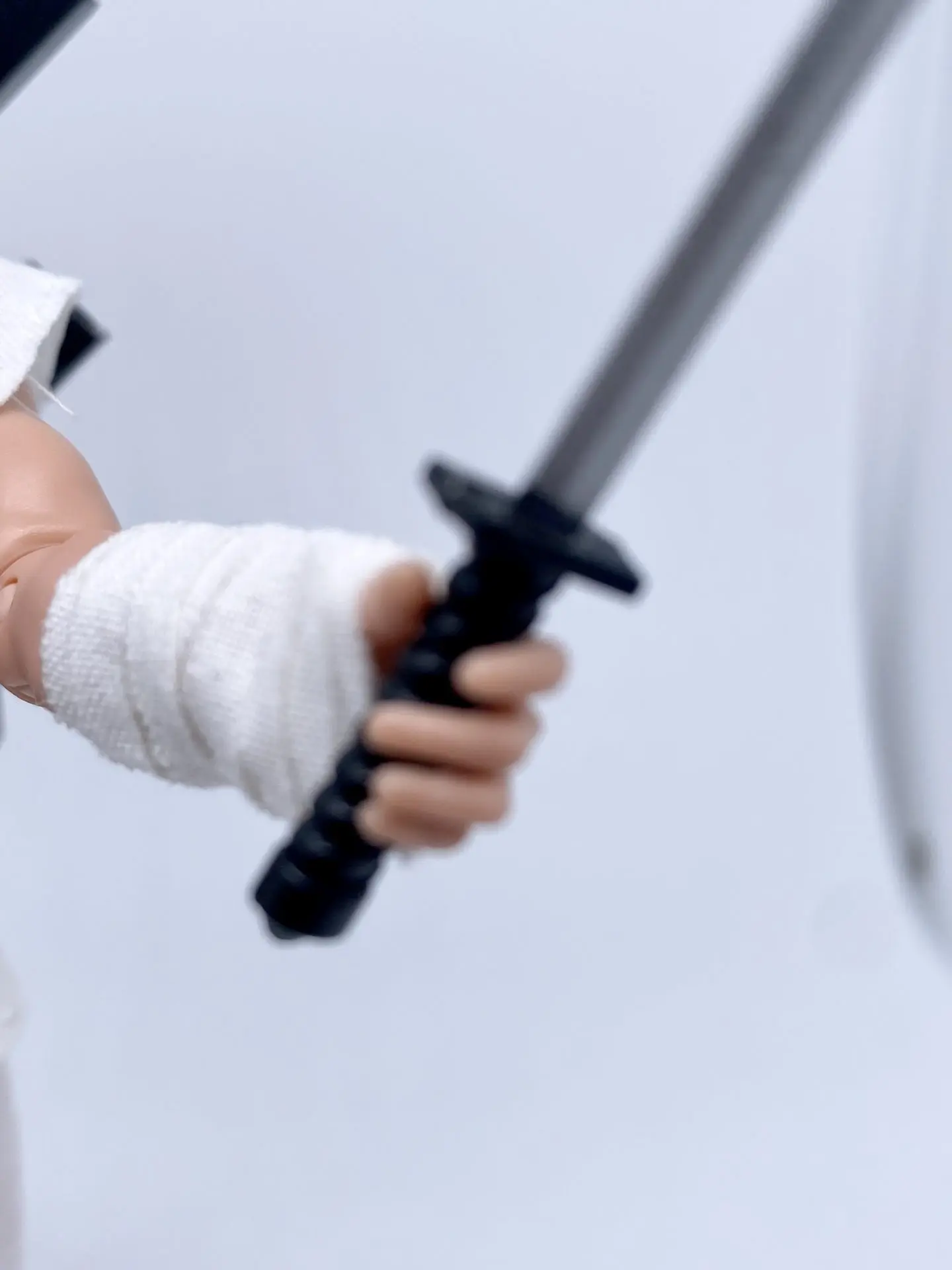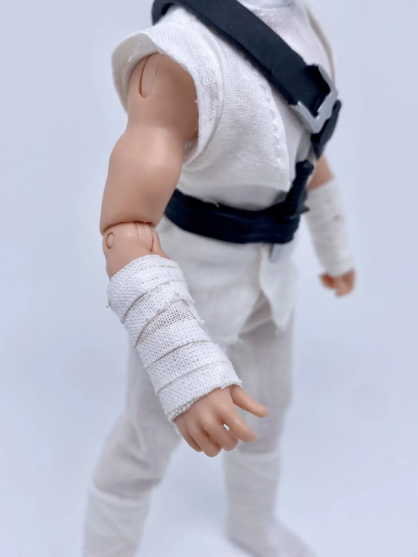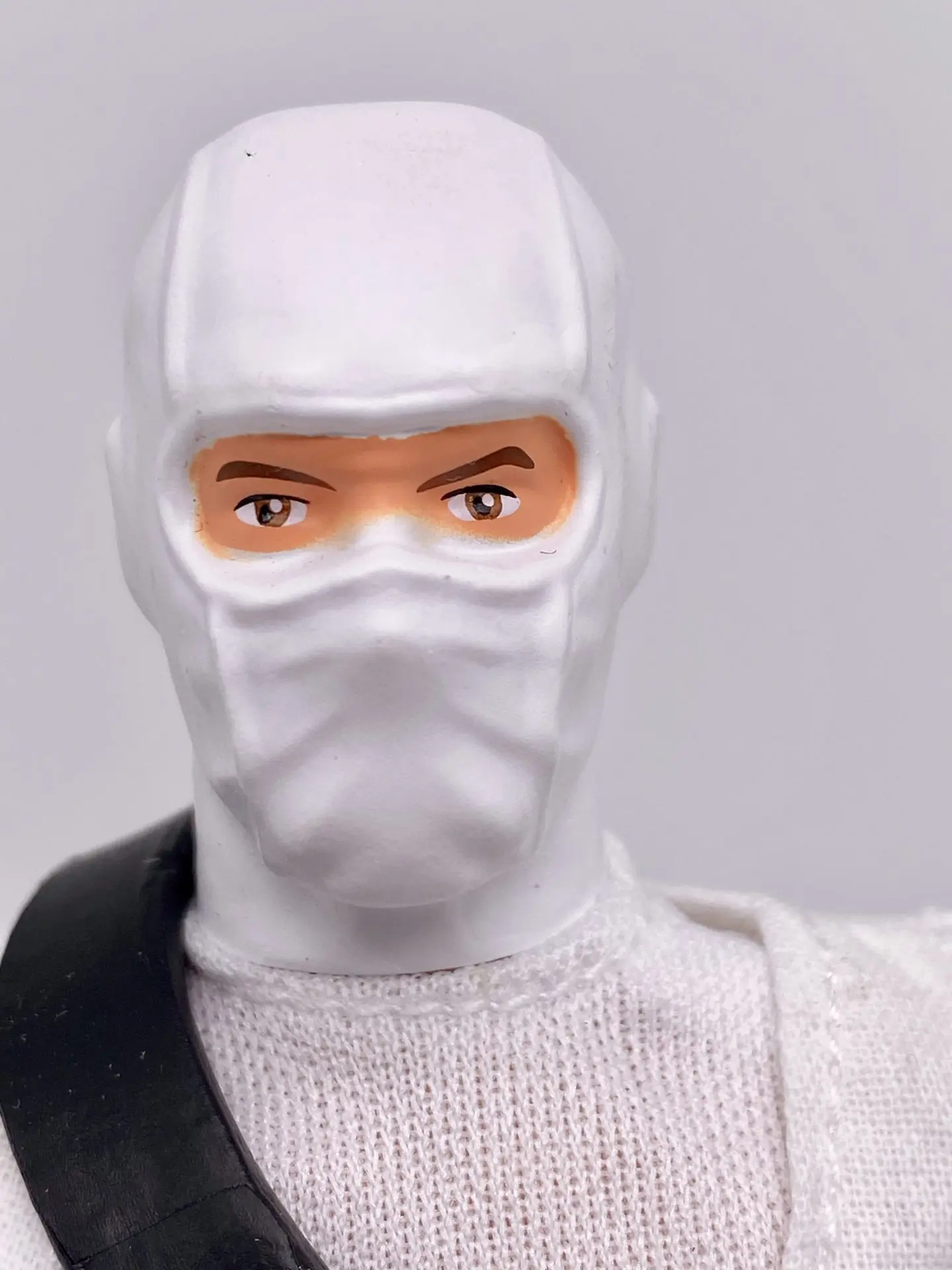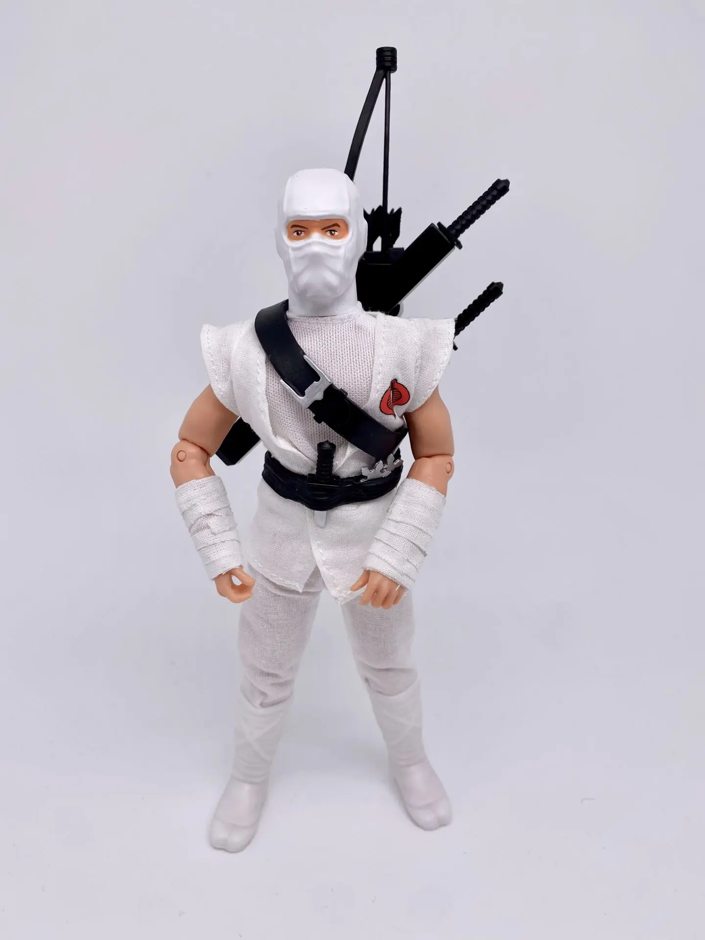 Storm Shadow is executed beautiful in the most classic A Real American Hero Mego style you could very ask for! This classic version of Storm Shadow is the perfect blend of Mego GI Joe crossover! Dressed in a gorgeous soft goods white Ninja Gi, you can see the beautiful job Mego did recreating Storm Shadows ARAH outfit! Complete with cut off sleeves, a red Cobra logo on the left chest and a layered textured shirt underneath, Storm Shadows outfit looks stunning! The stitching is beautifully done, and the quality of the soft goods outfit is outstanding! His pants are of a similar soft goods material and his boots are a flexible plastic. His wrists are wrapped in soft goods material as well, giving him a realistic Ninja look! I absolutely love this version of Stormie! Being such a vintage Mego fan, this is now my favorite modern interpretation of the vintage Storm Shadow by far! Storm Shadow also came packed out with all his classic accessories which we will cover below.