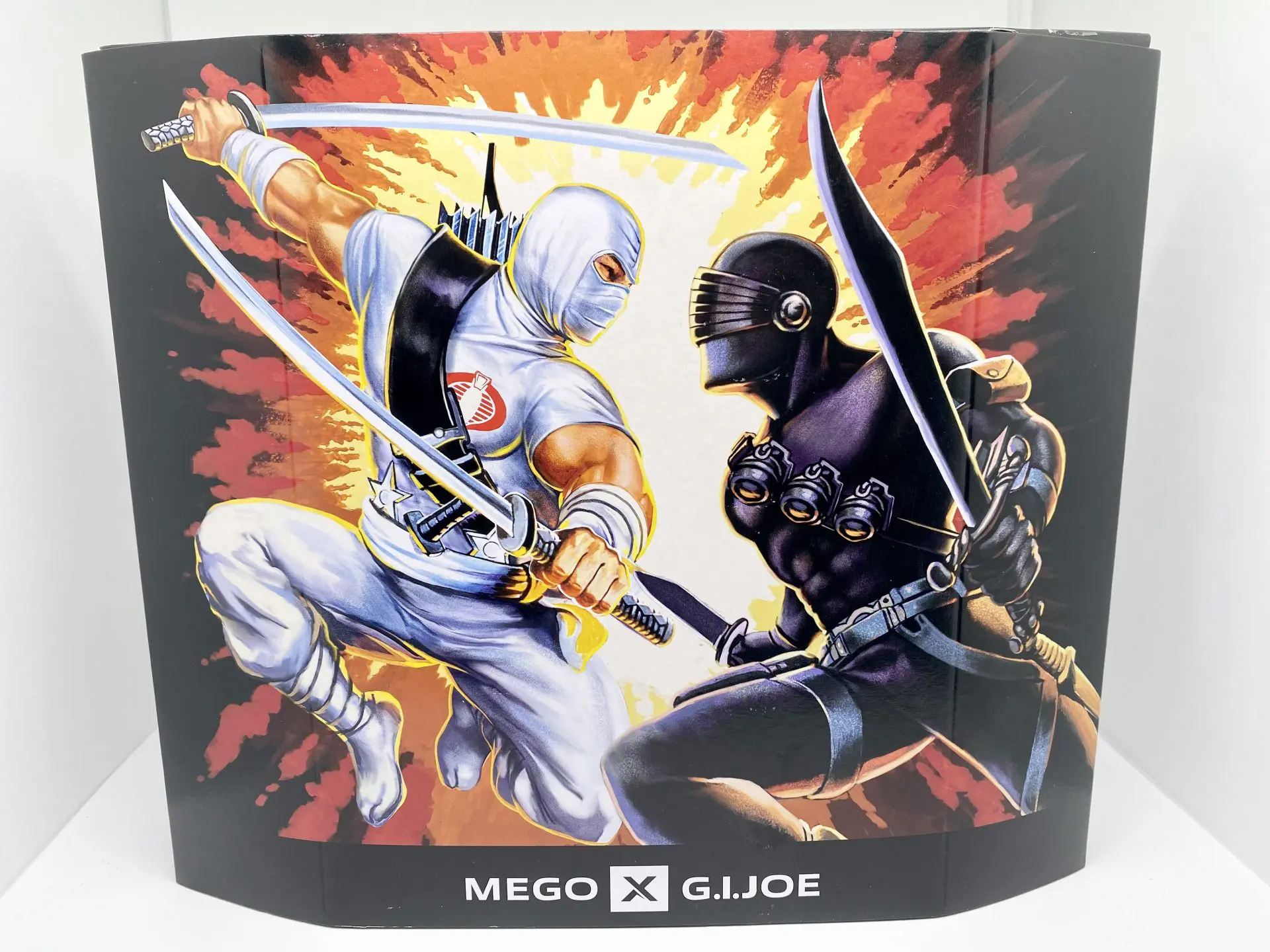 G.I. Joe x Mego Ninja Rivals Snake Eyes & Storm Shadow 2-Pack packaging is spectacular! You first start off with an outer sleeve over top of the box with gorgeous artwork featuring Storm Shadow and Snake Eyes going toe to toe with swords drawn ready to attack! It has the classic ARAH burst explosion in the background as well, which complete the classic scene. I just love this A Real American Hero vintage look to the front of the packaging!