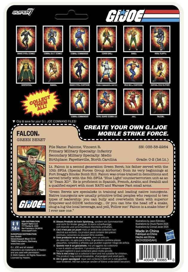 Official Description: Lieutenant Falcon is ready to lead the charge! Inspired by his appearance in G.I. Joe: The Movie, this 3.75” scale G.I. Joe ReAction+ Figure brings the Green Beret to life with movie-accurate paint and sculpt details and includes his signature backpack and laser blaster accessories, all packed on a full-color, illustrated blistered card back. Designed to look and feel like the vintage toys from the early ‘80s, this throwback figure also features O-Ring construction and 12 points of articulation, giving him ultimate posability for any battle-ready stance. The battle between G.I. Joe and Cobra-La is more intense than ever—don’t miss your chance to add this Lt. Falcon ReAction+ Figure to your collection!