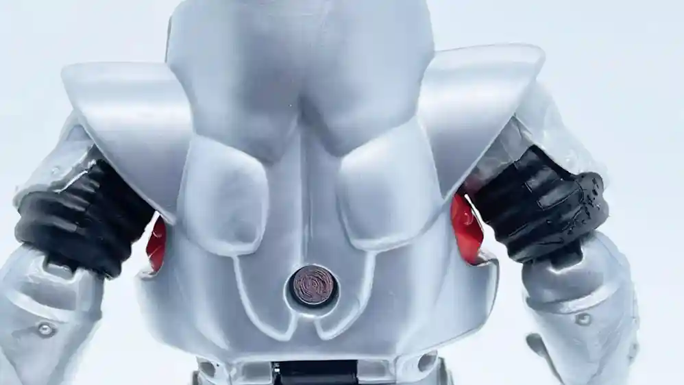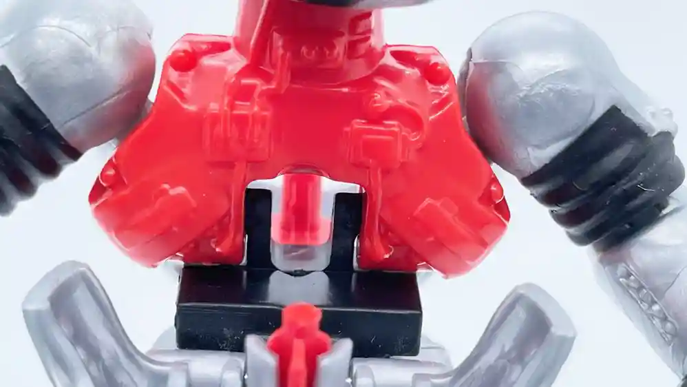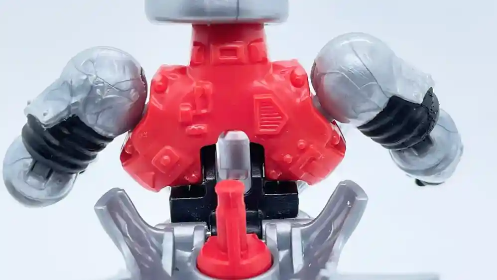 Remember when I said to wait for the armor to come bursting off? Well wait no longer but I am sad to report that the the armor does not burst off like described but upon pushing the red circular part of the Horde symbol, the chest merely unlatches, and you have to pull it down yourself. I think the parts are engineered with a tolerance that is so close the parts end up rubbing together, which prevents the armor from falling down by itself. Although a minor annoyance, the Horde Trooper does look cool all split apart. Once the armor pieces are down, you can get a good look at the inner workings of the Horde Trooper, and you can see the sculpted mechanical parts of the inside that are cast in red.