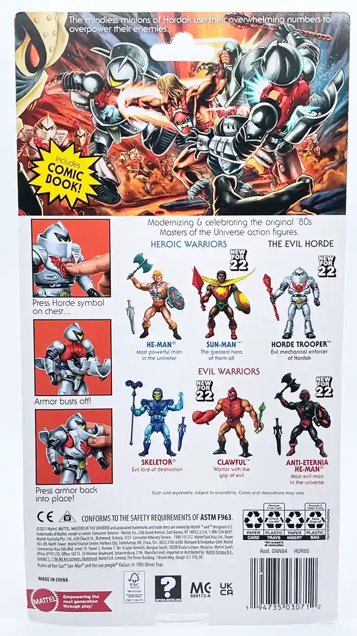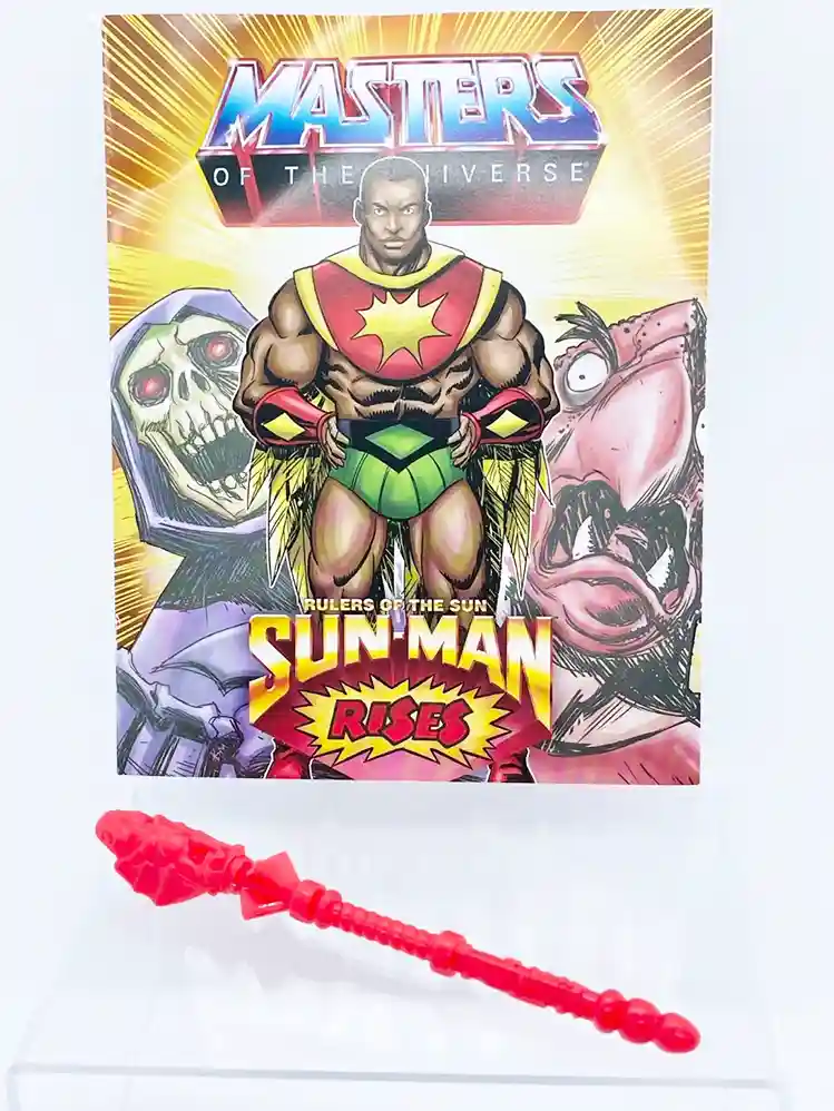 In the package, the Horde Trooper comes with a Mini Comic entitled Sun Man Rises and a red Techo Staff.