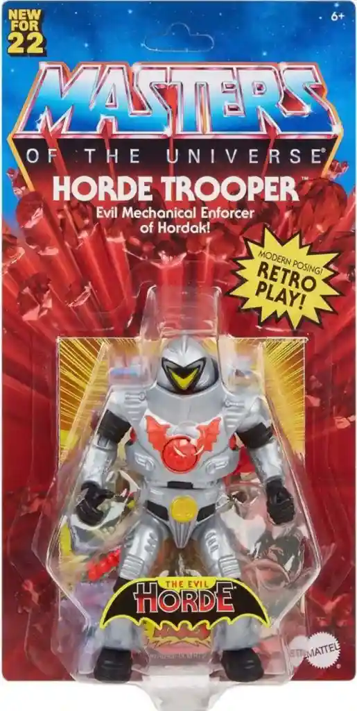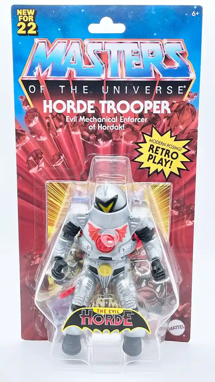The Horde Trooper is another Masters of the Universe unique piece of work. We got a taste of this Horde Trooper sculpt early as the Power Con 2021 red and black Horde Troopers thrust this amazing figure into existence. Given Mattel’s prior history of remaking the Power Con 2020 LOP Beast Man and Mer-Man as single carded figures, it was only a matter of time before we got this mechanical, maniacal evil collapsing robot who enjoyed tormenting the innocent people of Etheria. Horde Troopers are foot soldiers of the evil Horde Empire and are put to great use in numbers. Mainly deployed by Hordak for the occupation of Etheria, the Horde Trooper armies were also used during the Horde’s failed invasion of Eternia. This figure is a fantastic remake of the vintage figure with some major upgrades!