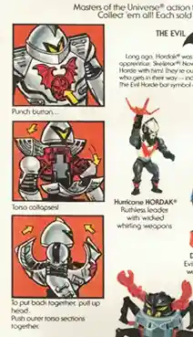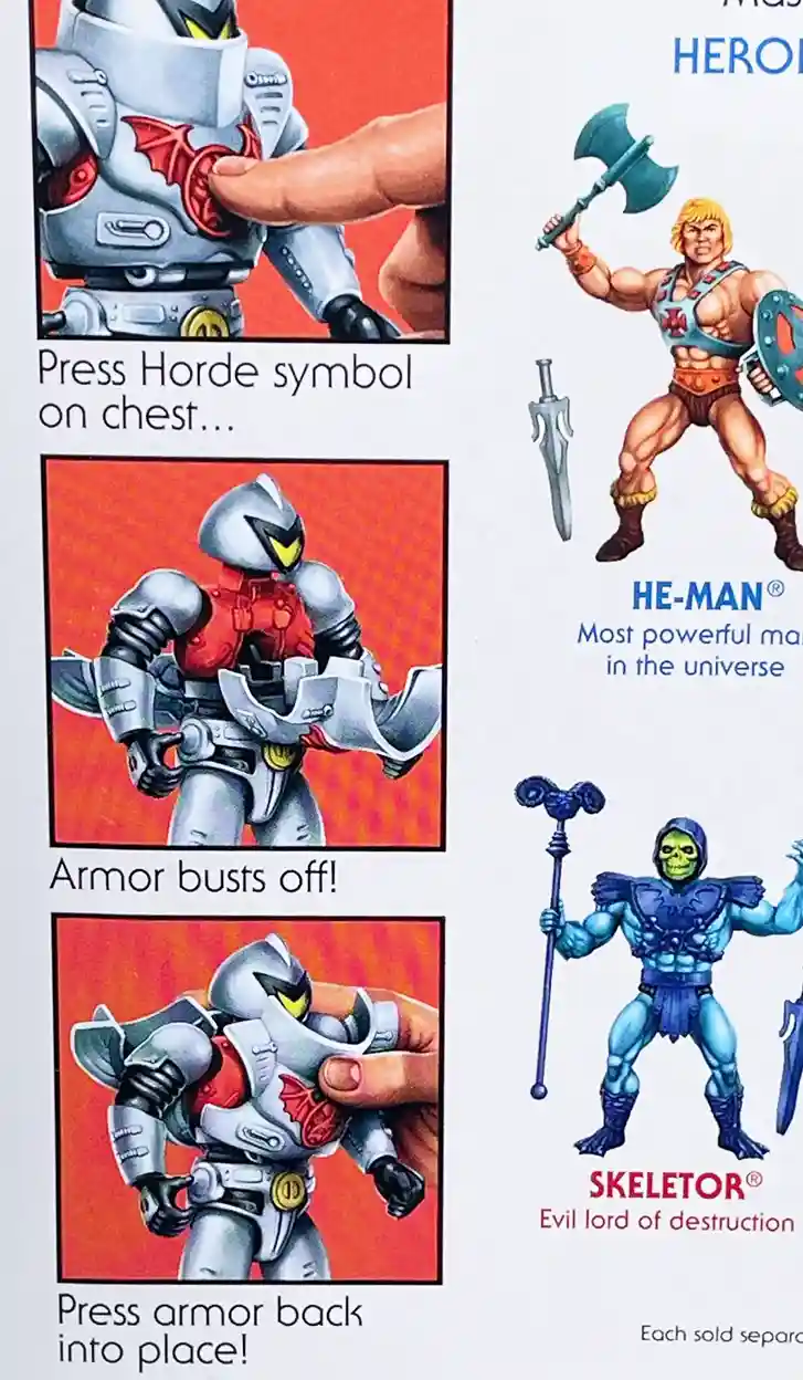 Like the vintage card backs that show you how the action features work, the MOTU Origins card is no exception. Simply press the red Horde symbol in the middle of the chest and BAM…the armor bursts right off…or does it? Well, you might have to wait to see a live action review or read more in the Action Feature section.