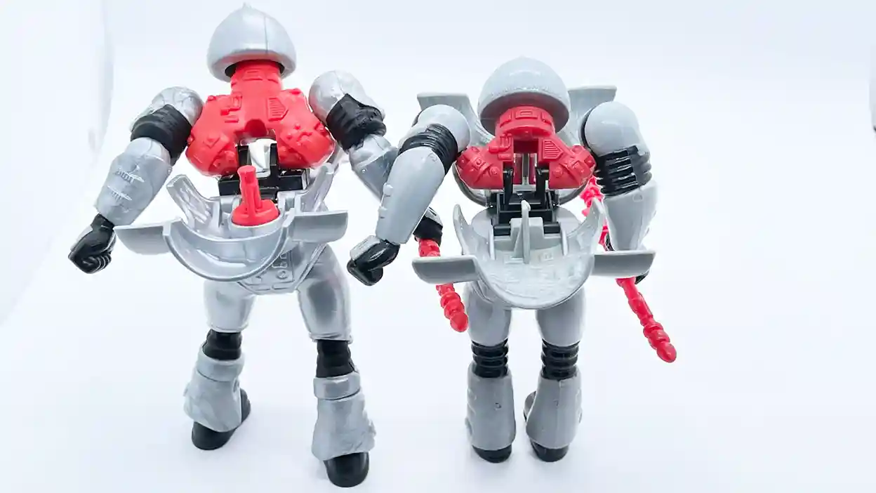 The rear of the Horde Troopers look very similar although you can also see from the back that the armored collar is is raised much higher in the Origins figure, giving it a more uniform look. From the waste down the figures look essentially the same although the black pieces separating the thighs and calves have more of a circular look. I think that aspect makes the vintage figure look more like a robot.