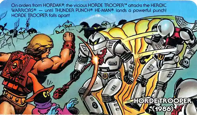 I’ve always thought that having Thunder Punch He-Man was odd as the center piece to the art but it makes sense looking at the vintage art (courtesy of the Battle Ram Blog). In a more dynamic battle scene, you can see Thunder Punch He-Man laying waste to the gaggle of Horde Troopers that are ascending on him while Hordak looks on in disgust. I think I am more excited about the possibility of getting a Thunder Punch He-Man down the line but the Origins card art is an updated homage to the vintage scene which essentially shows a different view of TP He-Man hitting the Horde Troopers dead center in the chest, activating the action feature.