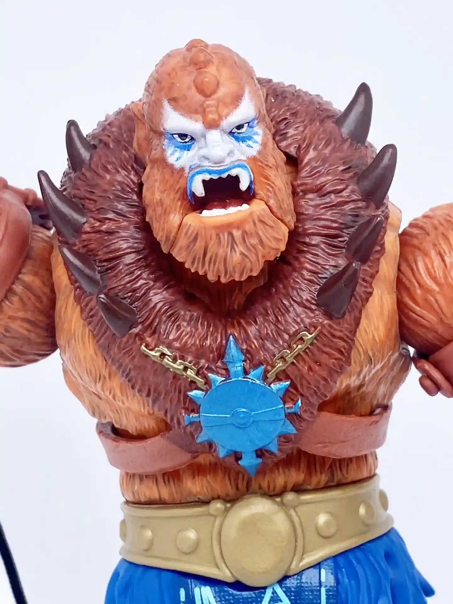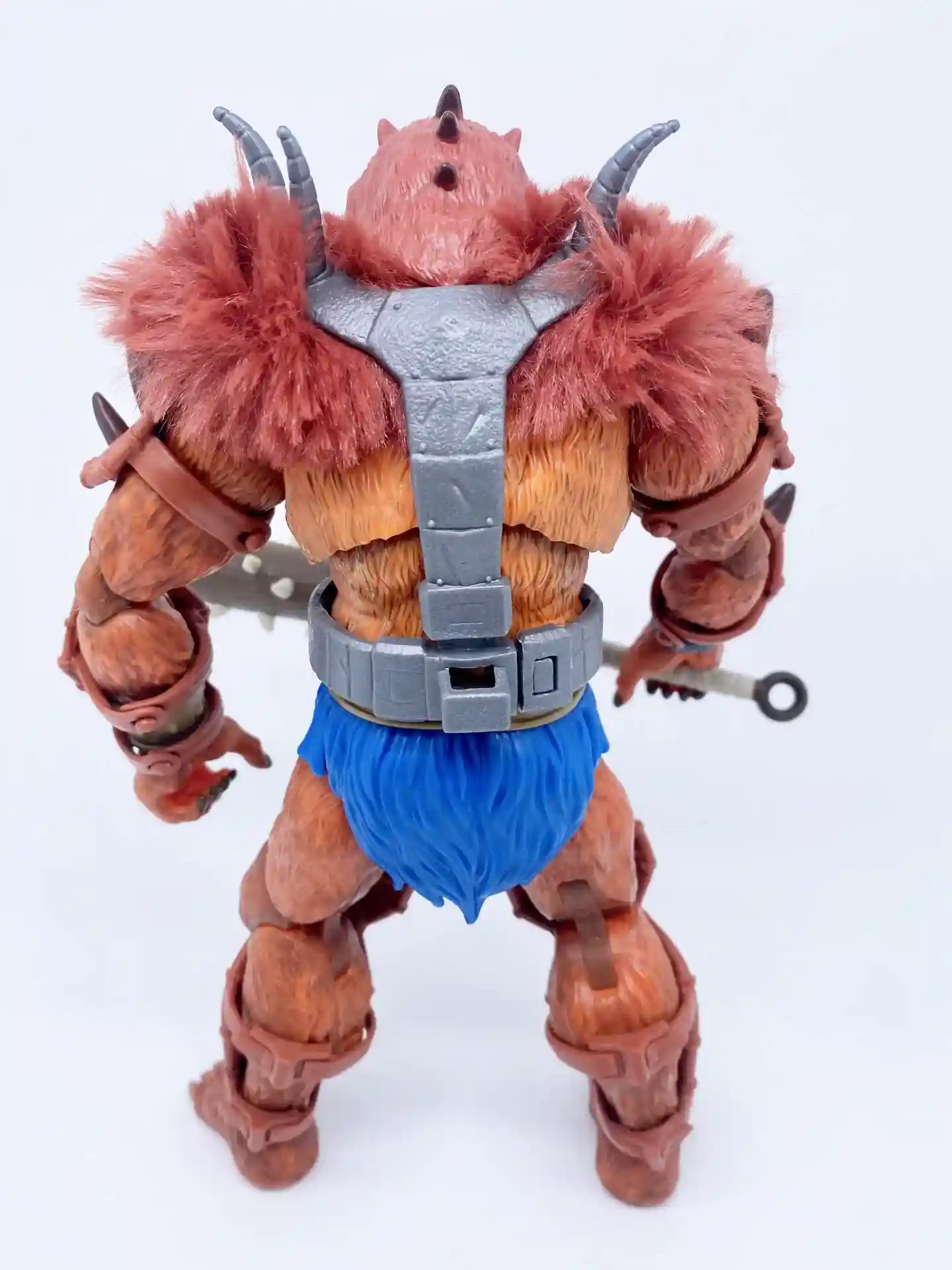 The paint wash really shines in his classic look, enhancing the fur texture across his chest, arms, and legs with a richer depth that makes the sculpt feel more natural. The darker tones settle into the creases, breaking up the solid orange and giving the figure a more rugged, worn-in appearance. It also helps define the details around his mane, bracers, and straps, making them stand out against the brighter blue of his loincloth. Compared to a flat finish, the wash adds a lot more character and brings out the vintage-inspired design in a way that feels true to the classic Beast Man.