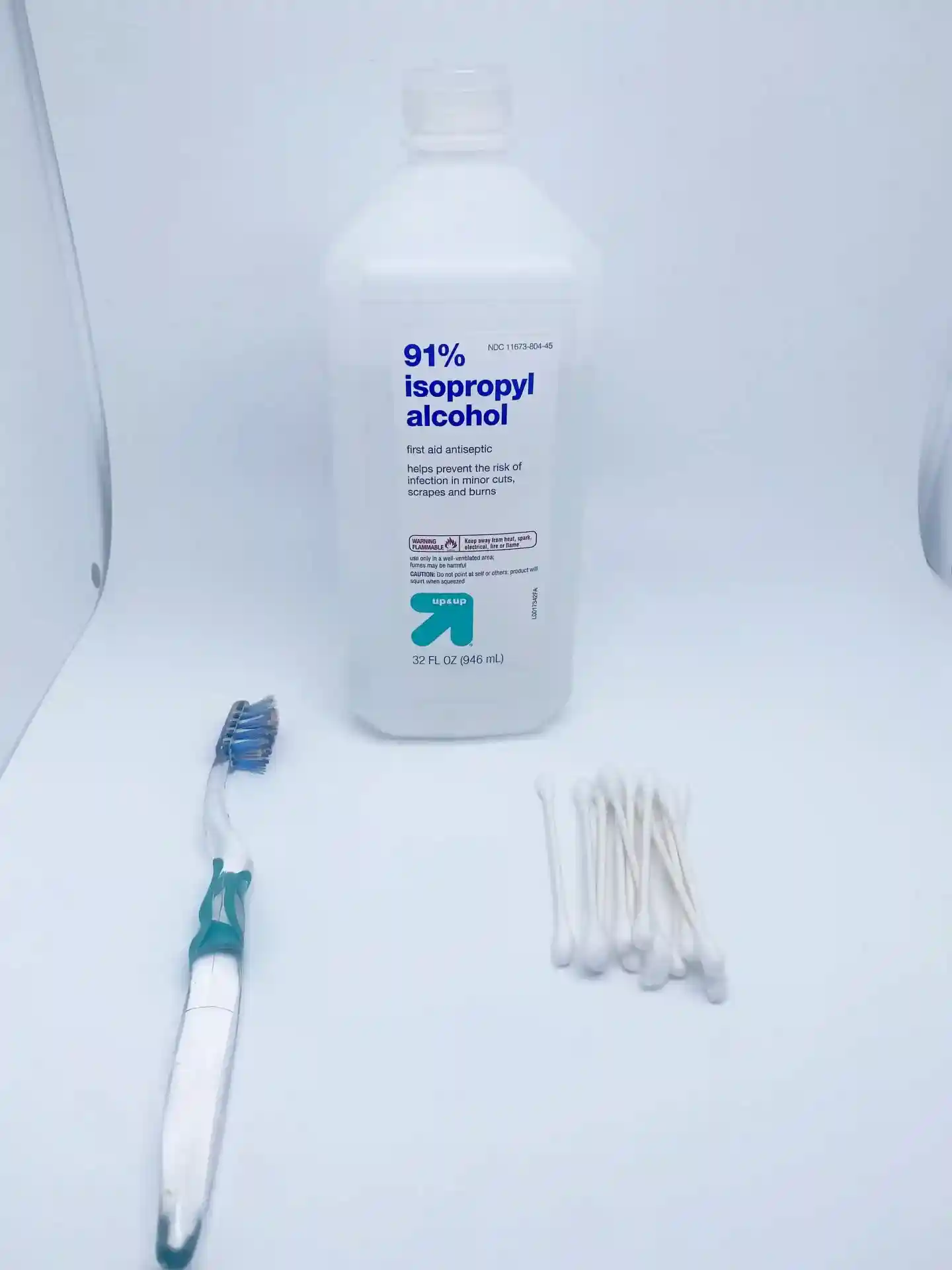 Grab your supplies. You will simply need regular household rubbing alcohol, a hand full of cotton swabs and an old toothbrush. I have standard 91% isopropyl alcohol, bought it at Target, but sold just about everywhere. DO NOT use nail polish or any other chemicals to rub off the paint, ONLY household Rubbing Alcohol!
