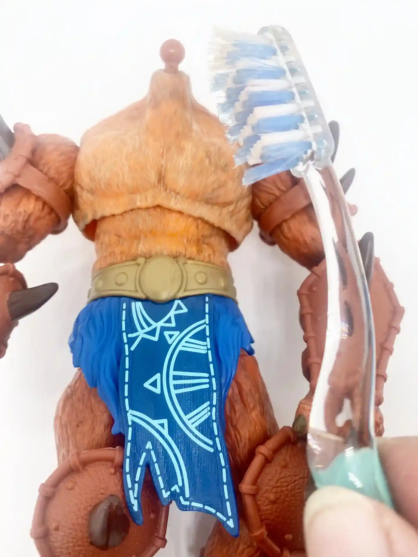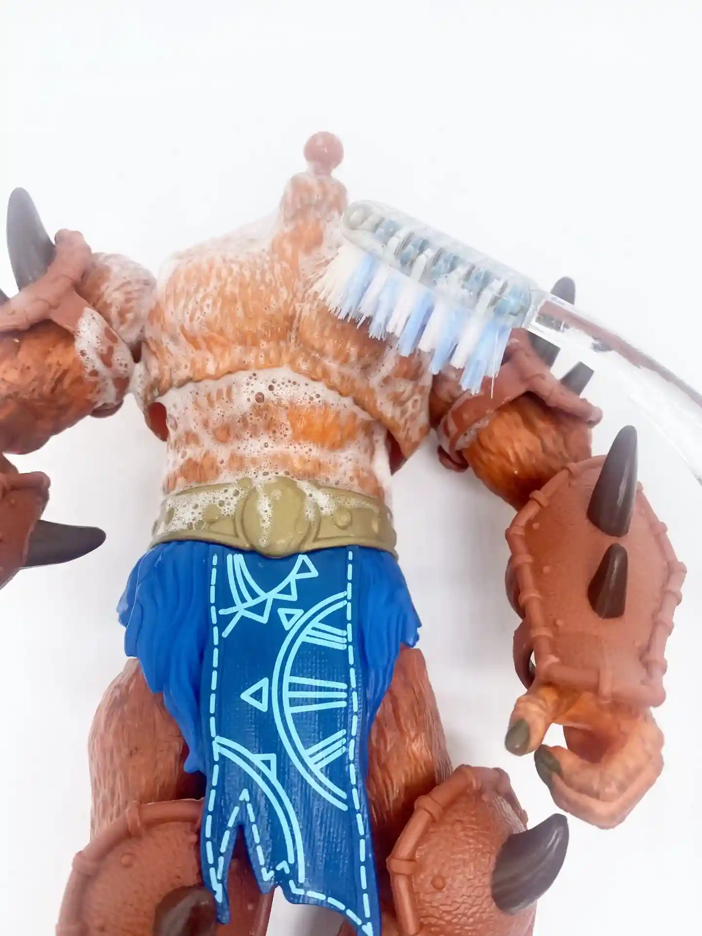 Once you think you got enough paint rubbed off, you will want to clean Beast Man off with soap and water. You may notice that when you were rubbing Beast Man with the alcohol covered swabs, it might have left a white cloudy residue. This is normal and will wash off with the soapy water. Just use an old toothbrush to do this. Just use any mild hand soap and water and clean his torso with the soapy toothbrush. Then dry him off with a clean towel. There will still be paint wash on his torso, but you will see that it does not look “brown” like it did before you started. It should look more of an orange plastic color with some brown paint wash, just like the rest of his arms and legs.