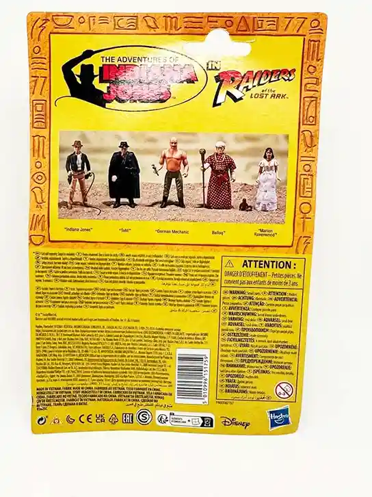 The Card Back is a beautiful recreation of the original Kenner Indiana Jones figures of the 1980’s except they are made of a very thin cardboard, just like the Star Wars Retro Collection. I am glad that they keep the design true to the original with the logo, and hieroglyphic piping around the edges. The Adventures of Indiana Jones logo looks so cool as well. And of course, it includes the “Raiders of the Lost Ark” logo as well! Marion looks like the damsel in distress holding a lit torch. The rear shows the cross sell of the rest of the wave.