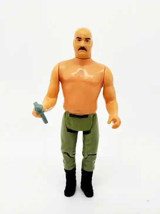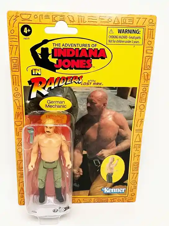 The German Mechanic is another classic vintage Kenner character. He looks tough, and I am sure you wouldn’t want to run into this guy in a crowded marketplace or working on your broken-down jeep! He comes complete with a wrench to work on Indy’s vehicles! The Card Back is similar to the rest but this one includes a portrait of the German Mechanic working on a jeep, right from the Raider’s of the Lost Ark movie. The rear shows the cross sell of the rest of the wave.