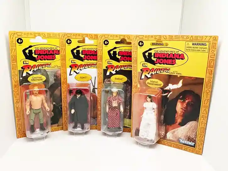 Indiana Jones fans are starting to get excited as the first wave of Indiana Jones Retro Collection figures are starting to hit Target Stores and now also available to preorder on EE! These new Wave 1 figures are overflowing with nostalgia and look just like their vintage counterparts! The card back artwork look amazing, straight outta the 1980’s Kenner Toy line, although thin and flimsy. These figures feature 7 points of articulation which include knee bends, so you can sit your figures on all those cool vehicles! Wave 1 consists of Indiana Jones, Marion Ravenwood, Toht, Belloq and the German Mechanic! Be sure to also check out our retro Indy review all his own! In the meantime, let’s dive into the rest of the Indiana Jones Retro Collection Wave 1 for an in hand review!