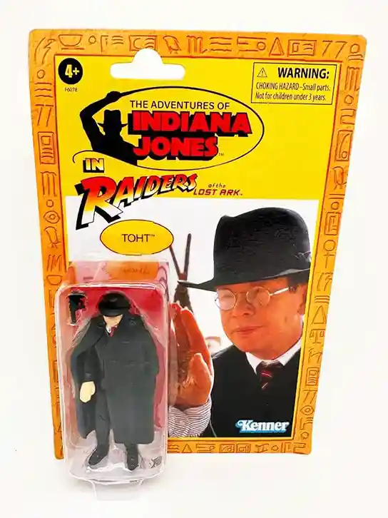 Toht, the quintessential bad guy! Another great recreation of the original vintage Kenner action figure. Toht comes with his black over coat and a revolver. This one is definitely a classic figure and a must have for Indiana Jones fans! His black trench coat is removeable, and he is wearing a black suit underneath. He has a red tie and red handkerchief in his breast pocket. Toht’s right hand is in that up position to make his signature hand gesture. He is also wearing his classic hat that is molded on his head. Toht has eyeglasses on his face which look great! The Card Back is similar to Marion’s but this one includes a portrait of Toht holding his right hand up, right from the Raider’s of the Lost Ark movie. The rear shows the cross sell of the rest of the wave.