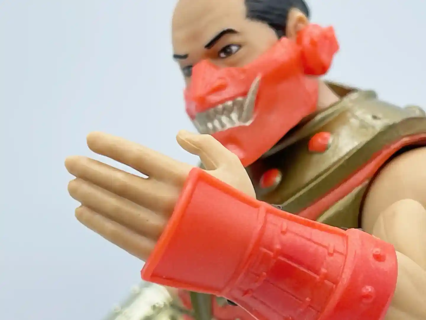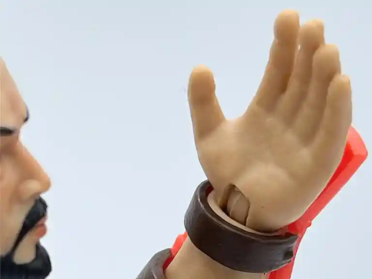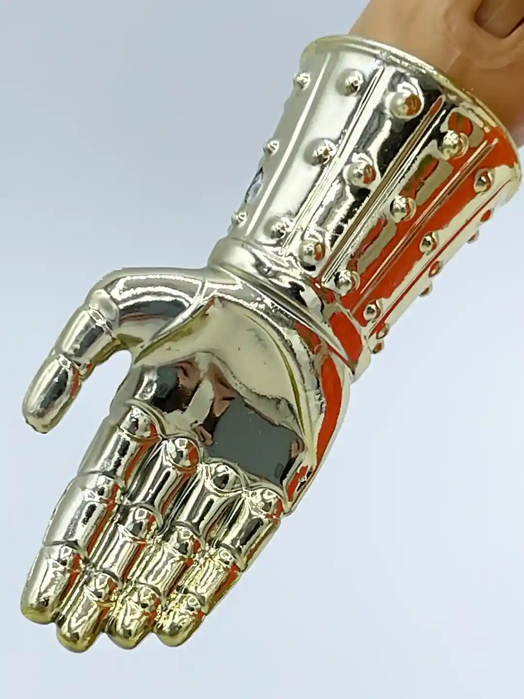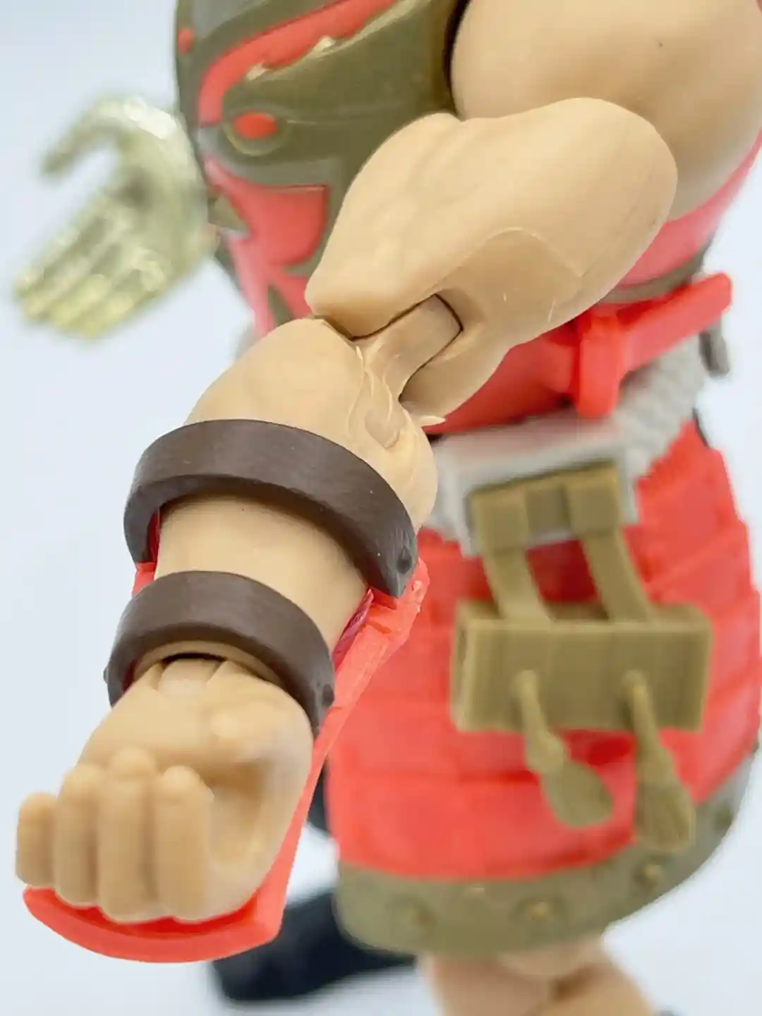 His left arm comes with a removable, red bracer bracer that covers the top of his left hand. On the underside, it features two brown straps that have a leather look them.