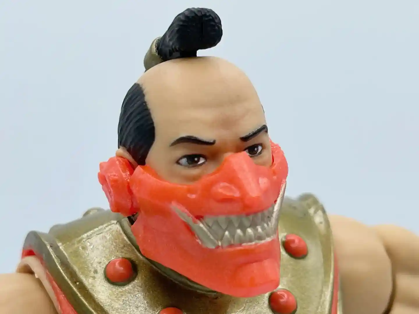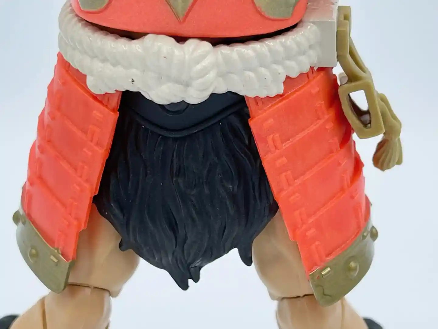 He also comes with a type of samurai half mask called a Men-yoroi and this type of mask is called a Menpō which covers the face from the covered the face from the nose down to the chin. The face mask is cast in the same orange plastic as his armor but his teeth have more of a silver tone. The mask can slip over his head and you can shimmy it down to settle it on his face with his ears covered.