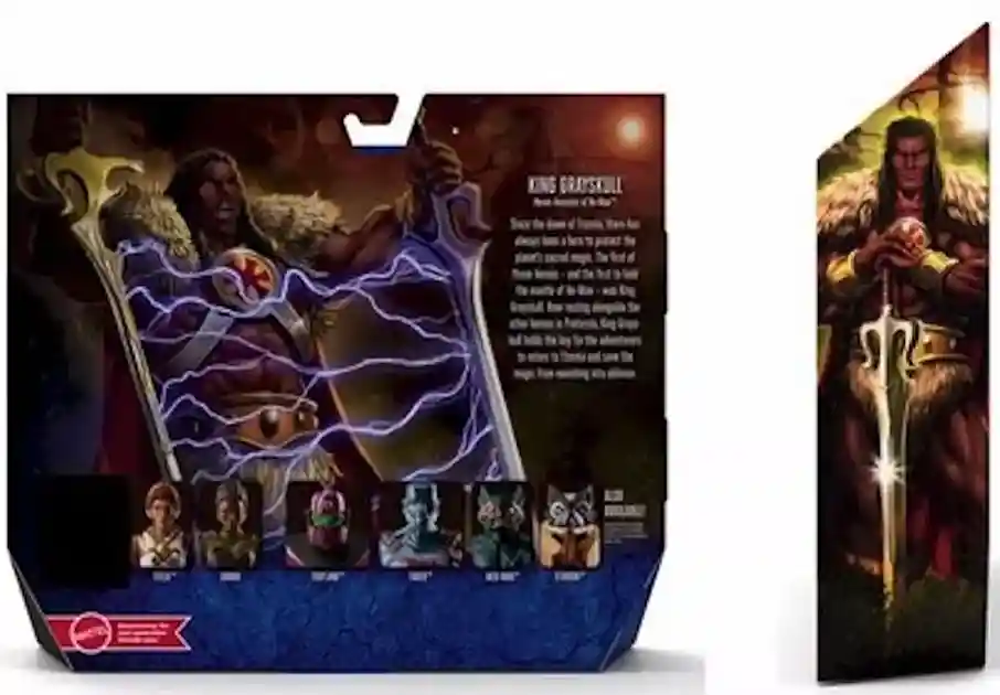 The box art is one of the best I’ve seen as the back of the shows King Grayskull holding two halves of the Power Sword with purple energy flowing between them. He also has a very determined look on his face as if he is trying to forge the swords back together himself. On the side of the box, he is illustrated in humble pose with the newly forged Power Sword!