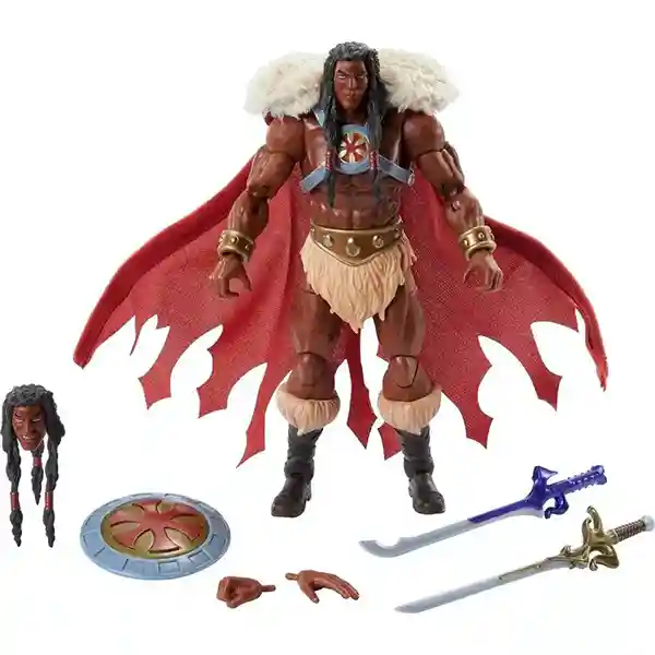 He also comes with a swappable head and pair of hands, shield, and the coolest of all weapons…two halves of the Sword of Power (one gold and the other purple). His cape is adorned with fur around the shoulders and has a wire in it, which makes it posable too!