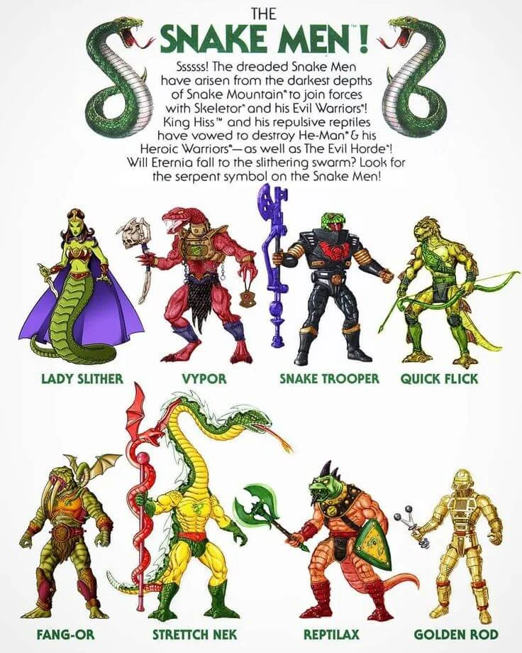 One of those snake men pictured was also the preview of the Camo Khan cardback art work, was Reptilax. Reptilax was part of the Snake Men Evil Warriors and is an unproduced character, so it is very interesting to see him illustrated on the back of the card art! He did appear in the vintage mini comc “King of the Snake Men”, and was featured illustrated on the cover. He looked to be a half human, half Snake Man character, with a snake like head & feet but with human torso, arms and legs. It appears that Lady Slither and Reptilax (among other) appear to be on the card art, which opens the door WIDE OPEN for this figures to be produced in the Origins line. Will this happen? One can only dream!