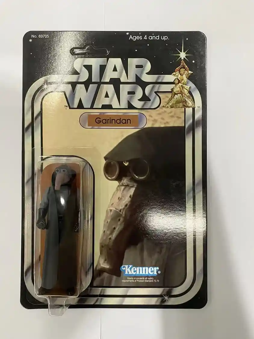 Revealed as part of the Star Wars Retro Collection Original Trilogy lineup, Garindan joins the 3.75-inch vintage-inspired figure series! Styled after his classic Kenner look, the figure features his distinctive snout mask, long black cloak, and communicator in hand. The yellow backdrop display showcased him among the “48 to collect” from the Original Trilogy, completing that nostalgic late-70s aesthetic that collectors love to see return.
