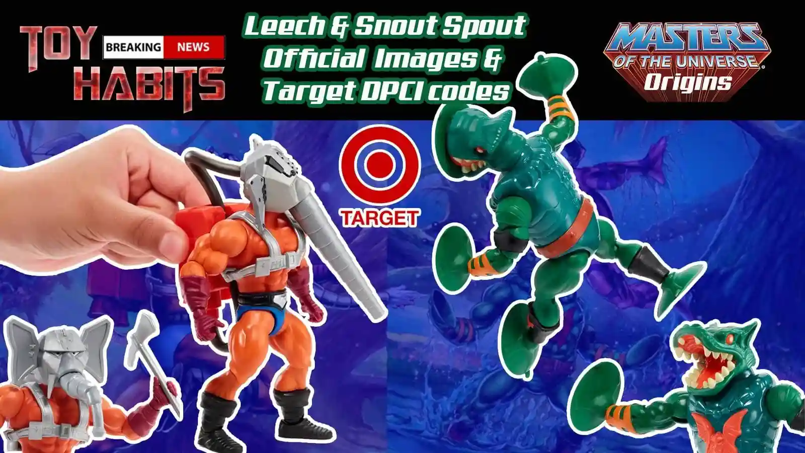 After all the early leaks of the MOTU Origins Leech & Snout Spout, we finally get official images of the figures and uncovered the Target DPCIs! People have been starting to find Snout Spout and Leech in Target stores, so be sure to check out all our DPCI information below to help you hunt these guys down! But in the meantime, you currently can pre-order Leech and Snout Spout at Entertainment Earth and Big Bad Toy Store at the links below. But be sure to also check our Masters of the Universe Origins Shop page often, as we are constantly updating links, and as soon as we get the Target and Amazon links, we will add to the page and let you all know!