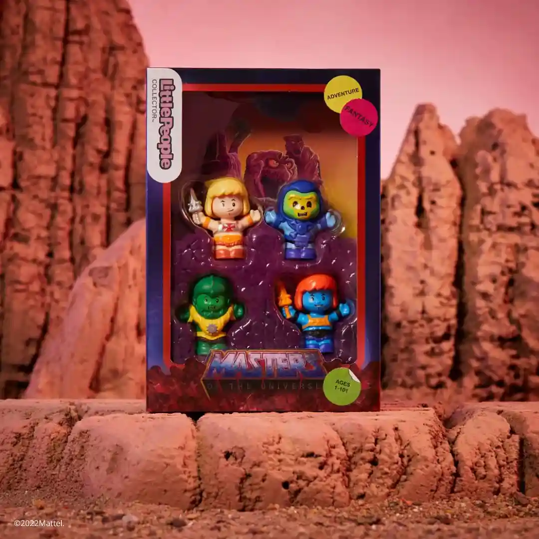 Little figures, big battles! Protect planet Eternia and defend the secrets of Castle Grayskull with this special edition Little People Collector Masters of the Universe figure set by Fisher-Price! Available 8/12 on MattelCreations.com! For this Mattel Creations Exclusive, the fight comes to Snake Mountain, as seen on the packaging. We love how the design team channeled an ‘80s VHS-tape-box vibe for inspiration.
