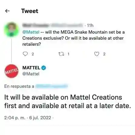 Thanks again to yo_tengo_el_poder, as suspected from clues via Amazon and the Euro Mattel Shop, Mattel confirmed via Twitter that the Mega Snake Mountain set that will available for preorder FIRST on Mattel Creations, will be available through other online retailers at a later date.