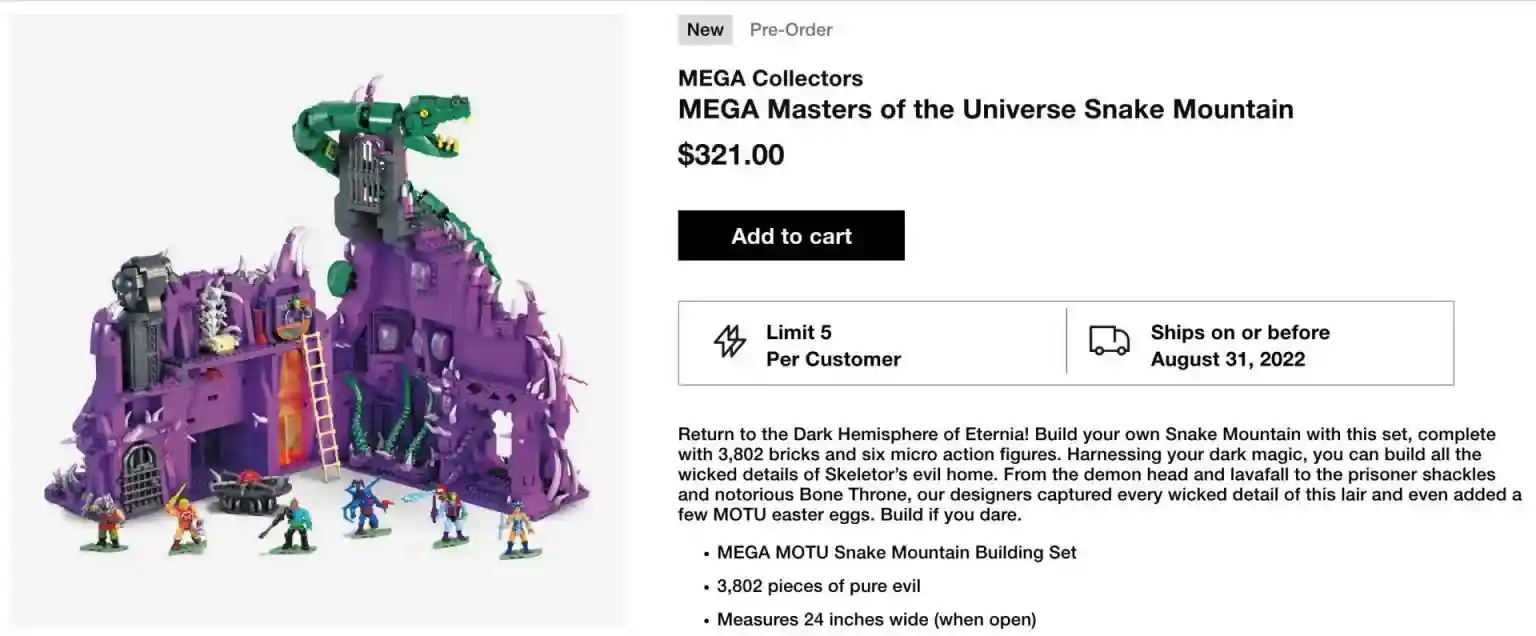 The MEGA Snake Mountain set is live on Mattel Creations for preorder with a ship date on or before August 31, 2022. If you were hoping to use your $10 off coupon you received for the Wun-Dar debacle, you are out of luck as it does not appear to work for Snake Mountain!